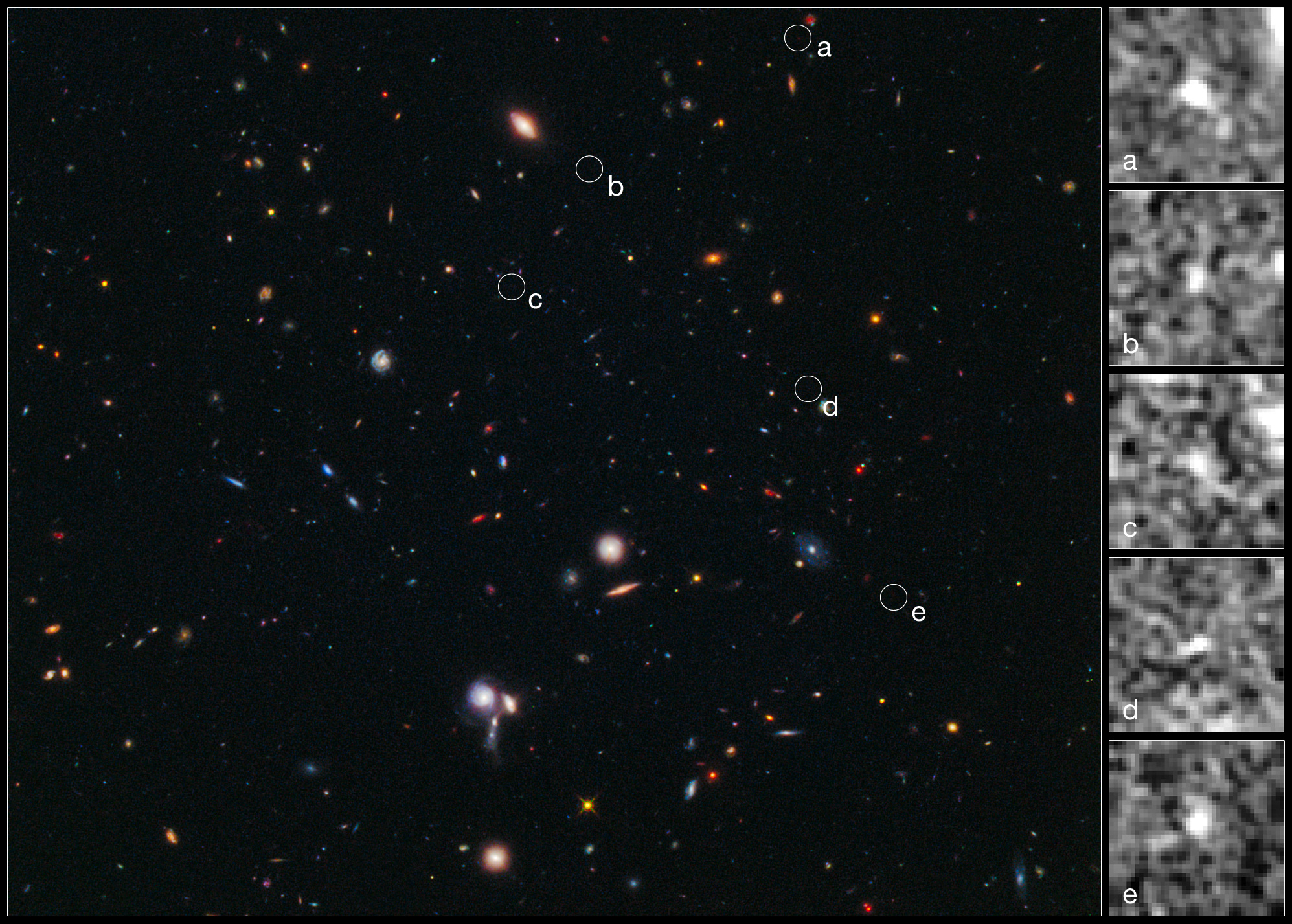 The composite image at left, taken in visible and near-infrared light, reveals the location of five galaxies clustered together just 600 million years after the Universe's birth in the Big Bang. The circles pinpoint the galaxies.