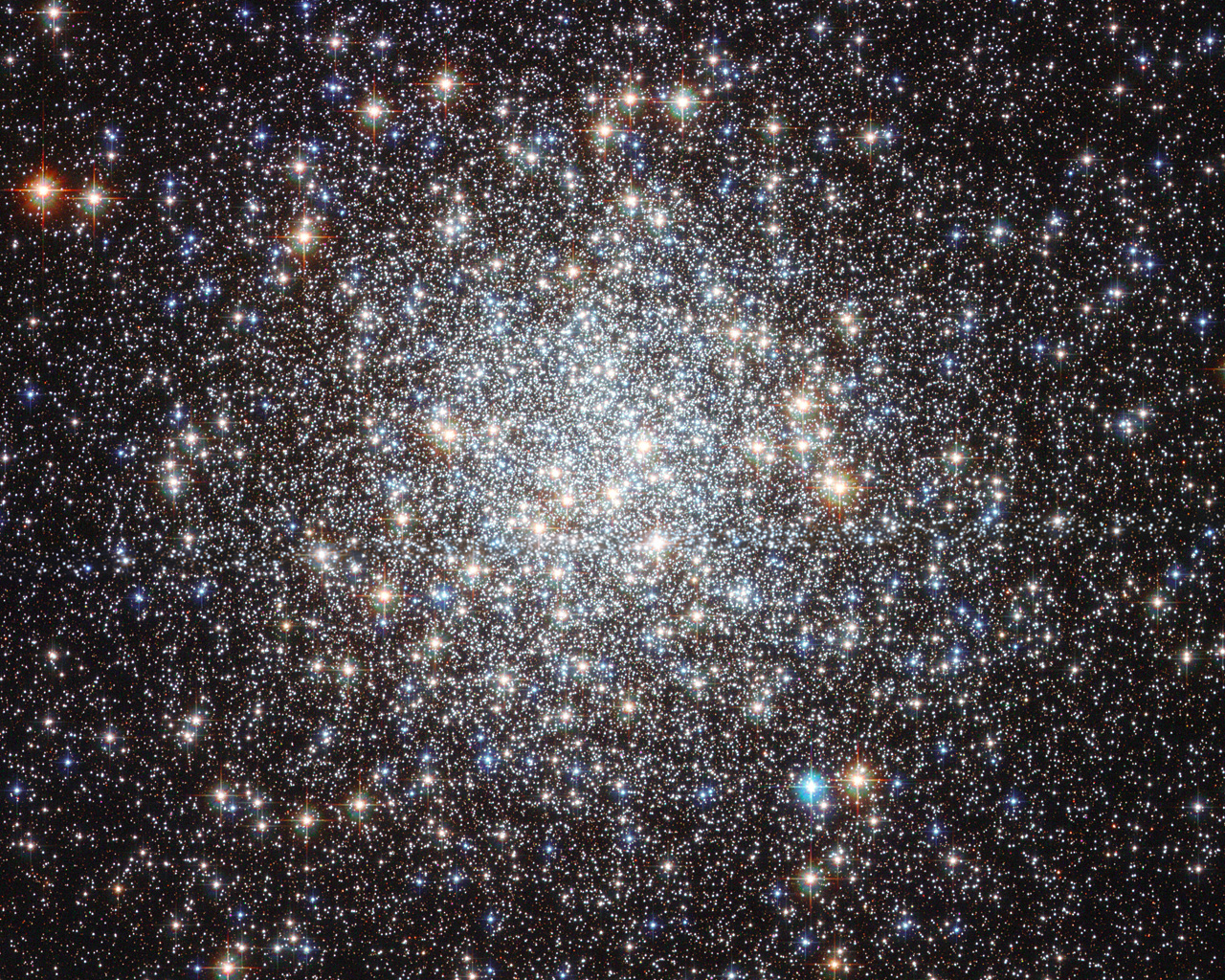 This image from the NASA/ESA Hubble Space Telescope shows the globular cluster Messier 9. Hubble's image resolves stars right into the centre of the cluster, and clearly shows they have different colours. Redder colours signify lower surface temperatures, while blue stars are extremely hot.
