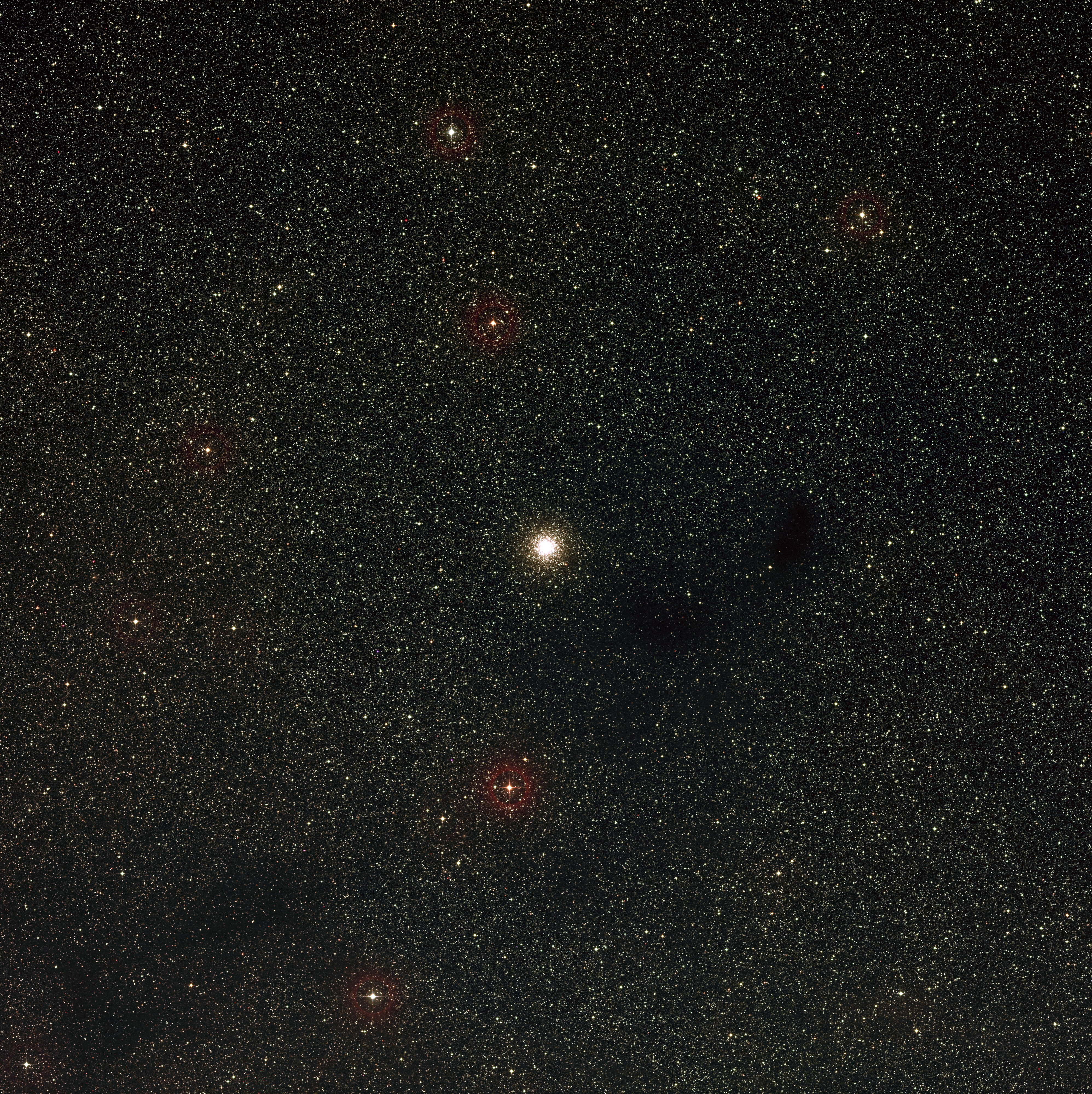 This image from the Digitized Sky Survey 2 shows a wide-field view of globular cluster Messier 9 and its surroundings, imaged by a ground-based telescope. The dark patches are clouds of interstellar dust. Immediately to the right of Messier 9 is the dark cloud Barnard 64.