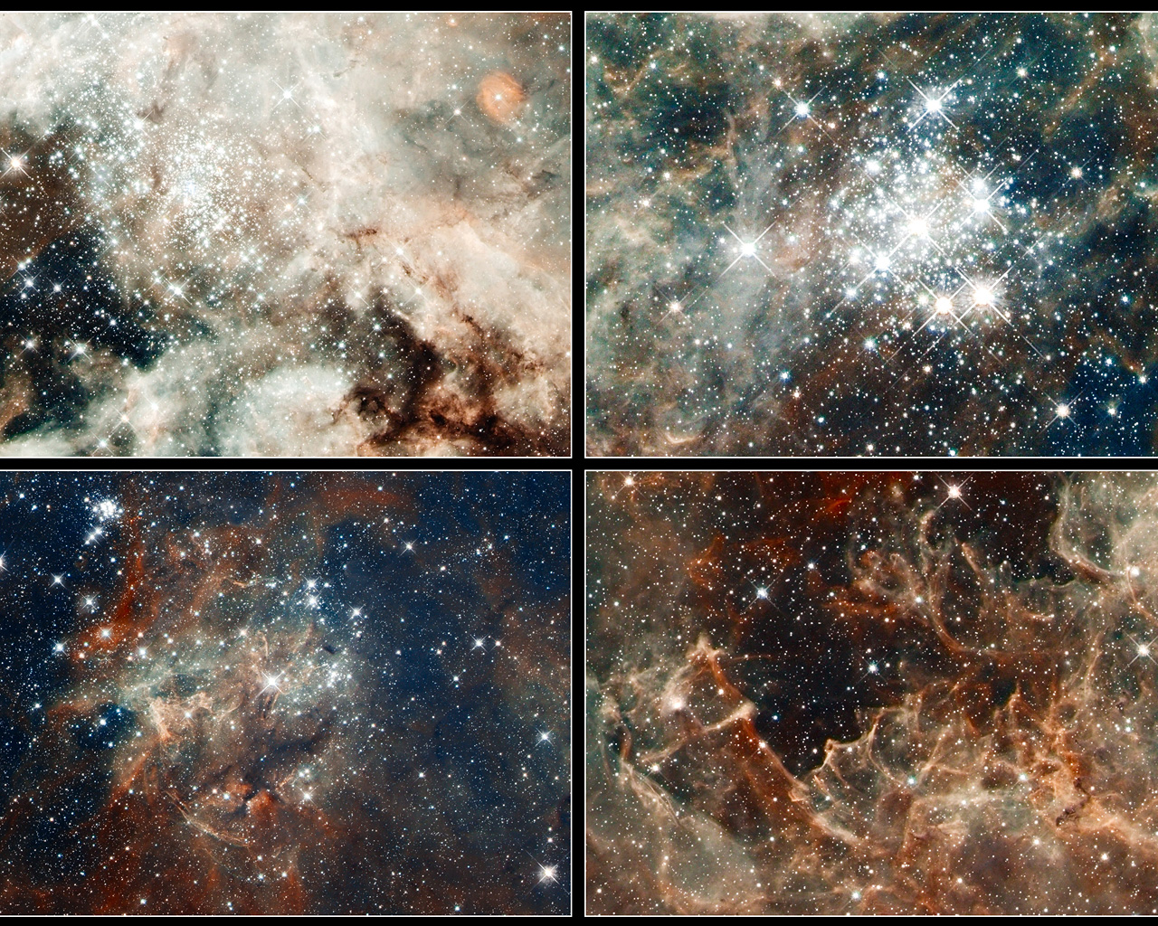 From massive star clusters to sculpted gas embedded with fledgling stars, these four close-up images underscore why 30 Doradus, located in the heart of the Tarantula nebula, is a star-making factory.