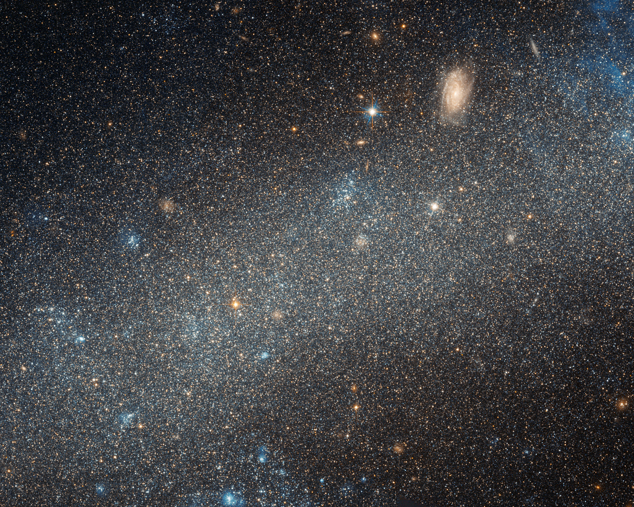 The NASA/ESA Hubble Space Telescope has made detailed observations of the dwarf galaxy NGC 2366. While it lacks the elegant spiral arms of many larger galaxies, NGC 2366 is home to a bright, star-forming nebula and is close enough for astronomers to discern its individual stars.