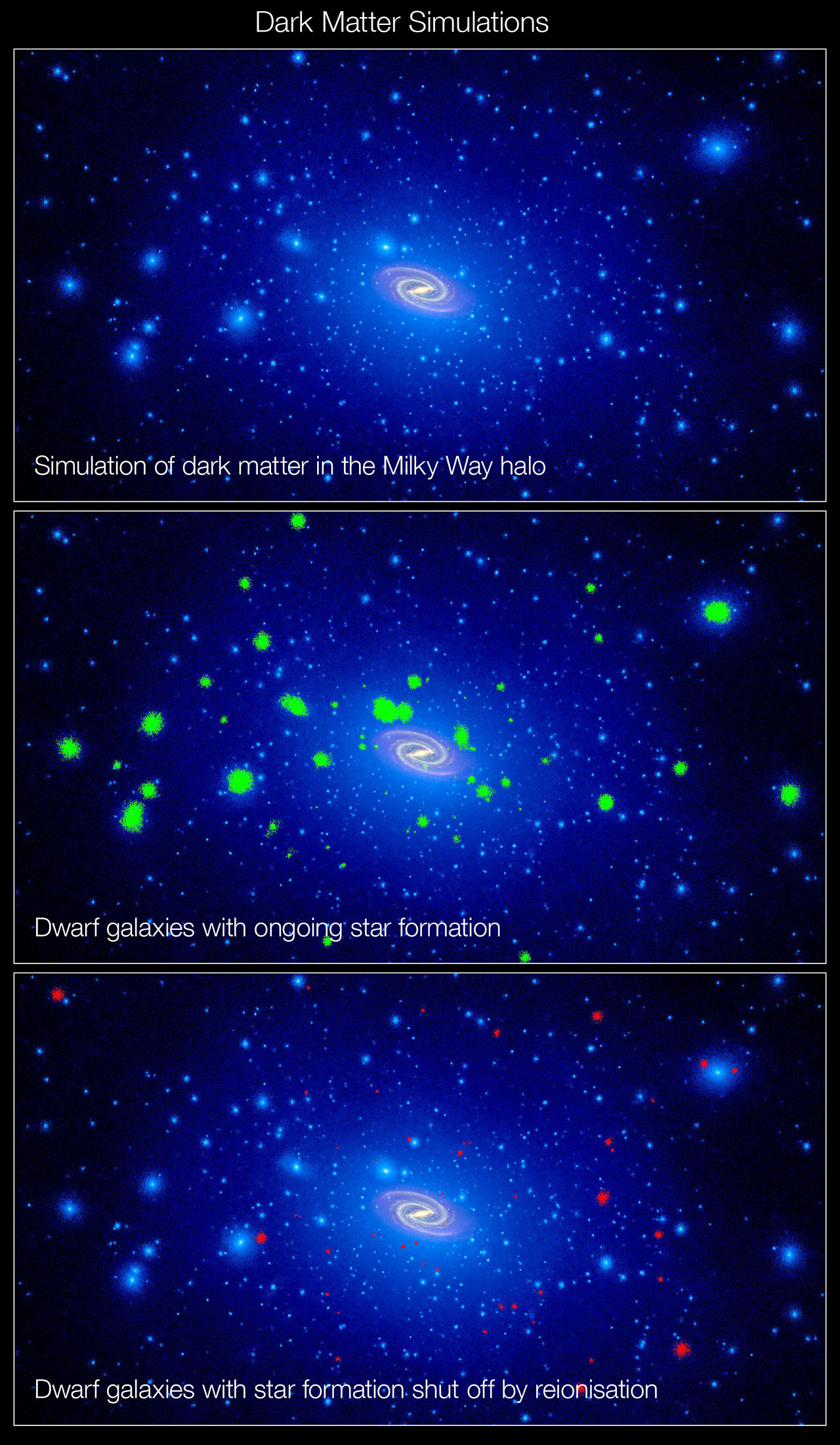 These illustrations, taken from computer simulations, show a swarm of dark matter clumps around our Milky Way galaxy. Some of the dark-matter concentrations are massive enough to spark star formation. Dark matter is an invisible substance that accounts for most of the universe's mass.