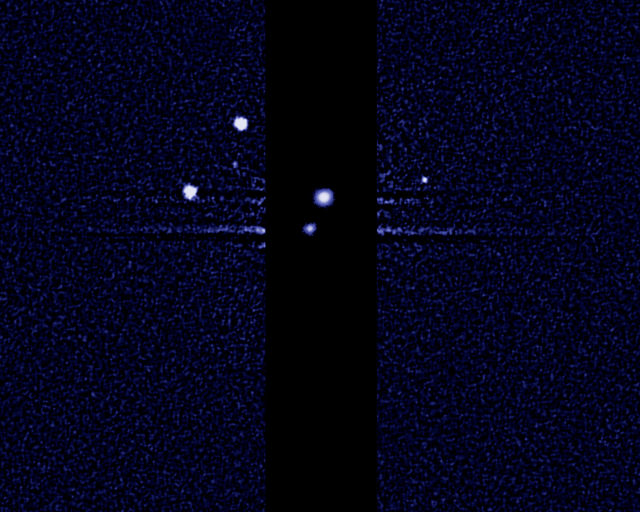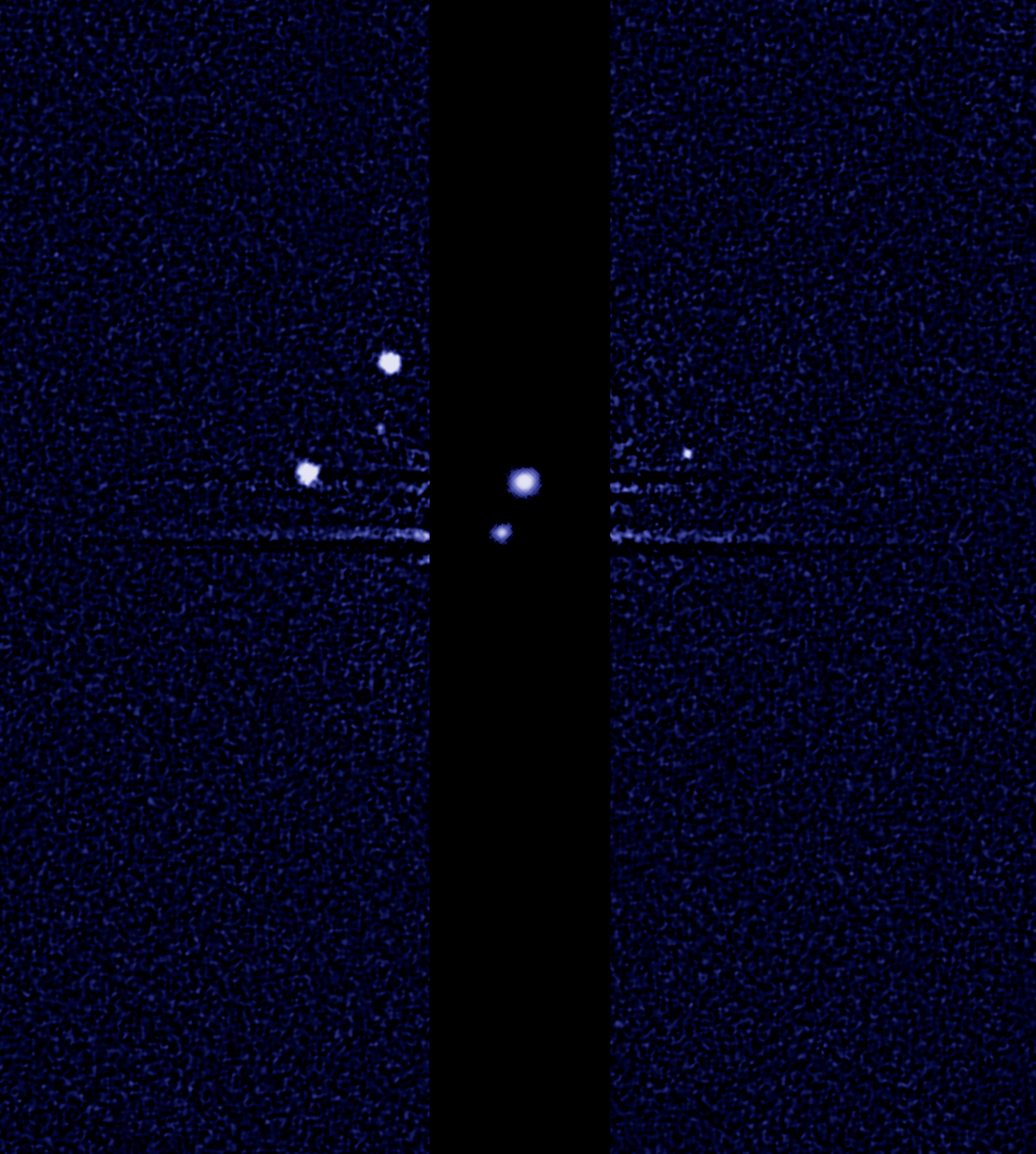 The darker stripe in the centre of the image is because the picture is constructed from a long exposure designed to capture the comparatively faint satellites of Nix, Hydra, P4 and S/2012 (134340) 1, and a shorter exposure to capture Pluto and Charon, which are much brighter.