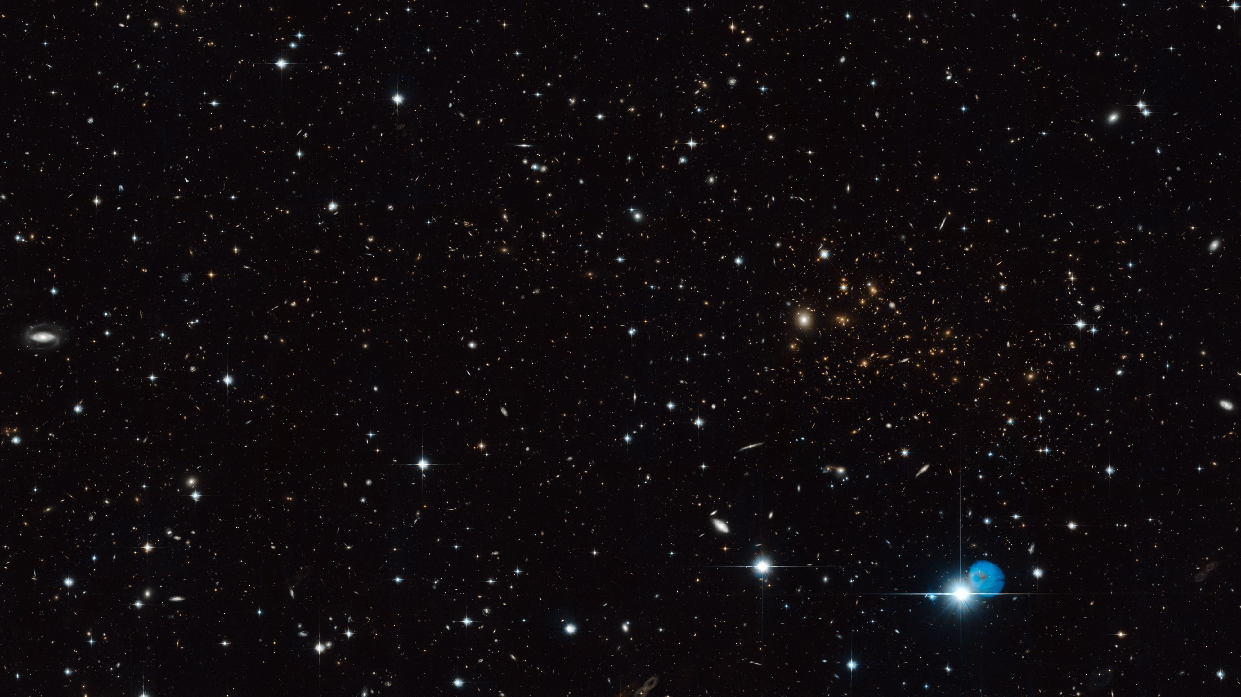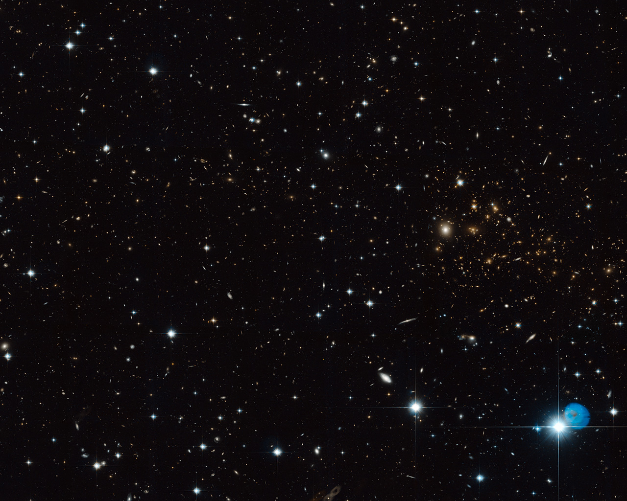 This enormous image shows Hubble's view of massive galaxy cluster MACS J0717.5+3745. The large field of view is a combination of 18 separate Hubble images.