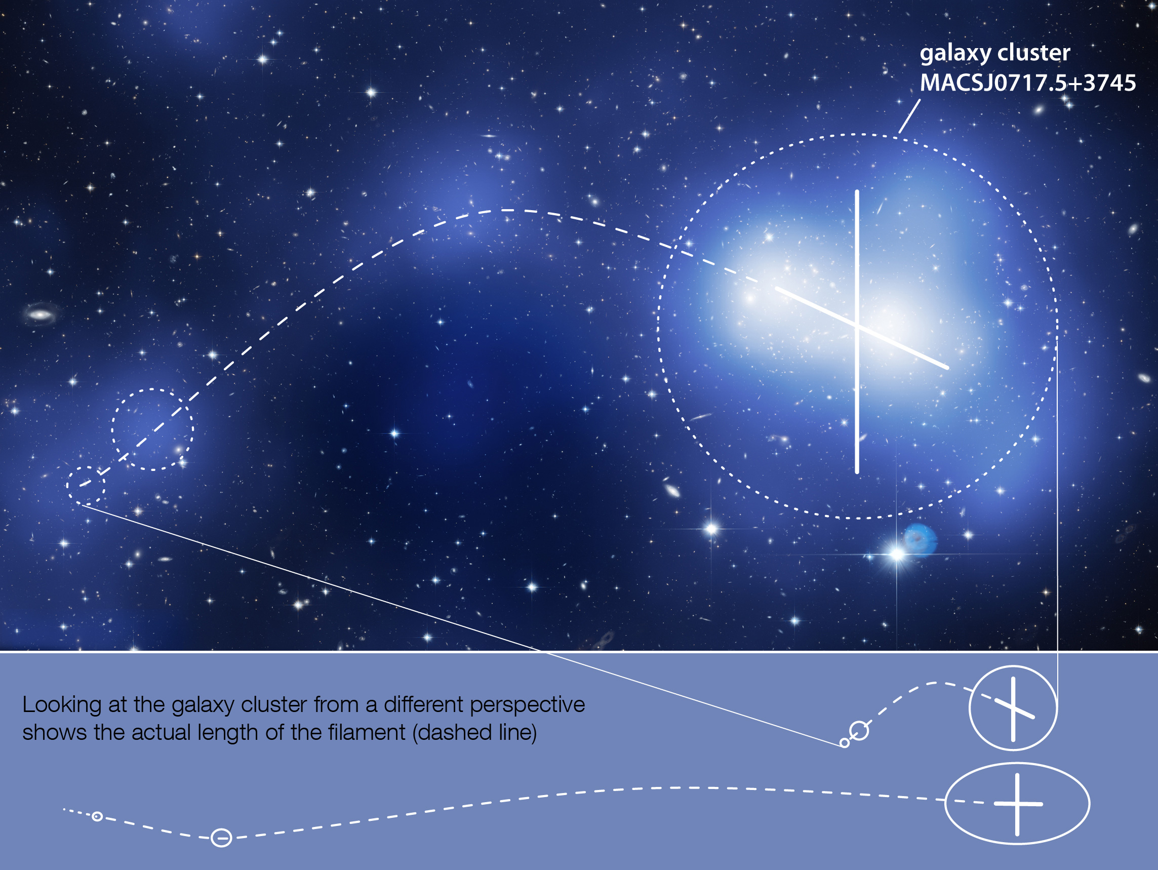 This diagram shows Hubble's image of MACS J0717 overlaid with the location of the cluster and filament's mass (in blue), and with a schematic of the cluster and filament (in white). Below, the diagram shows the geometry from our perspective in which the filament lies almost directly along our line of sight, and from a different perspective in which the filament is seen side-on. This shows how the filament appears greatly foreshortened from our perspective.