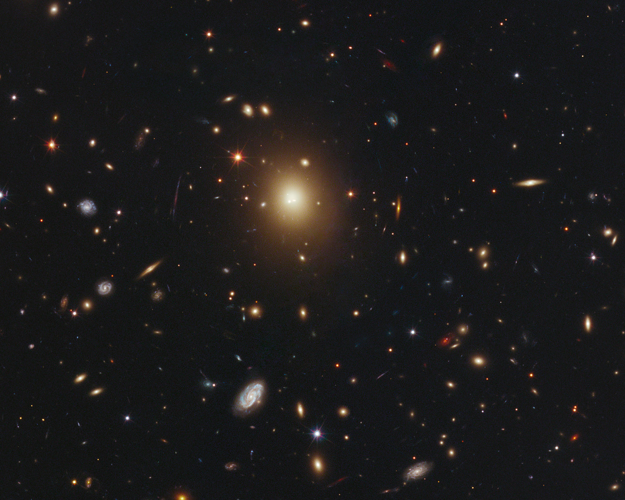 The giant elliptical galaxy in the centre of this image, taken by the NASA/ESA Hubble Space Telescope, is the most massive and brightest member of the galaxy cluster Abell 2261. Astronomers refer to it as the brightest cluster galaxy (BCG).