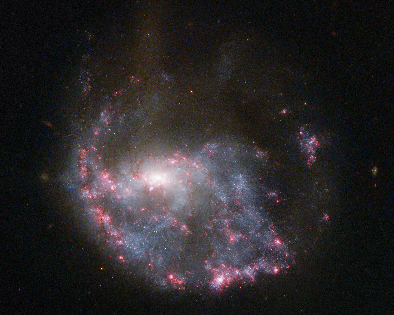 An almost complete circle of bright pink nebulae skirts around a spiral galaxy in this NASA/ESA Hubble Space Telescope image of NGC 922. The ring structure and the galaxy's distorted spiral shape result from a smaller galaxy scoring a cosmic bullseye, hitting the centre of NGC 922 some 330 million years ago.