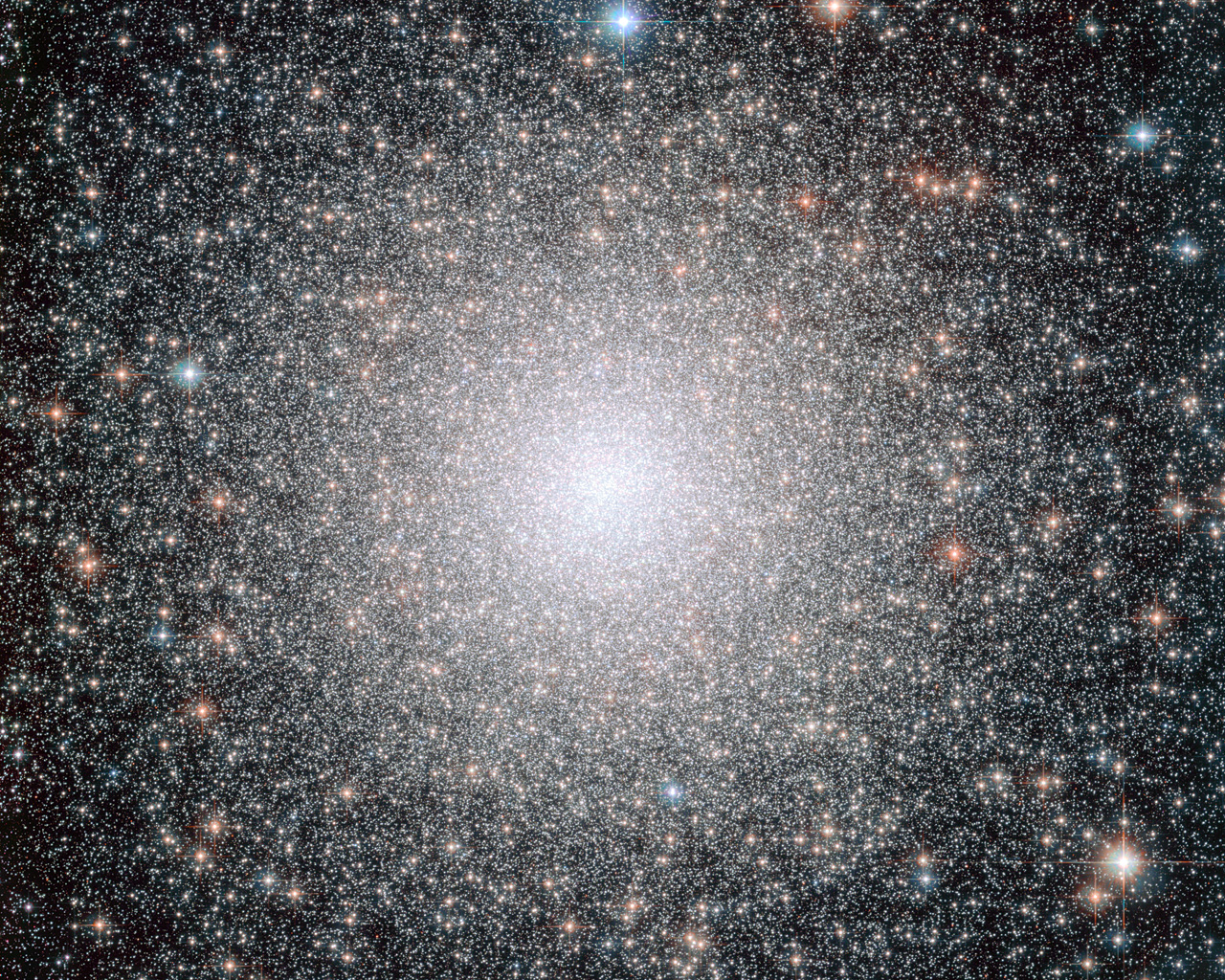 This image from the NASA/ESA Hubble Space Telescope shows NGC 6388, a dynamically middle-aged globular cluster in the Milky Way. While the cluster formed in the distant past (like all globular clusters, it is over ten billion years old), a study of the distribution of bright blue stars within the cluster shows that it has aged at a moderate speed, and its heaviest stars are in the process of migrating to the centre.