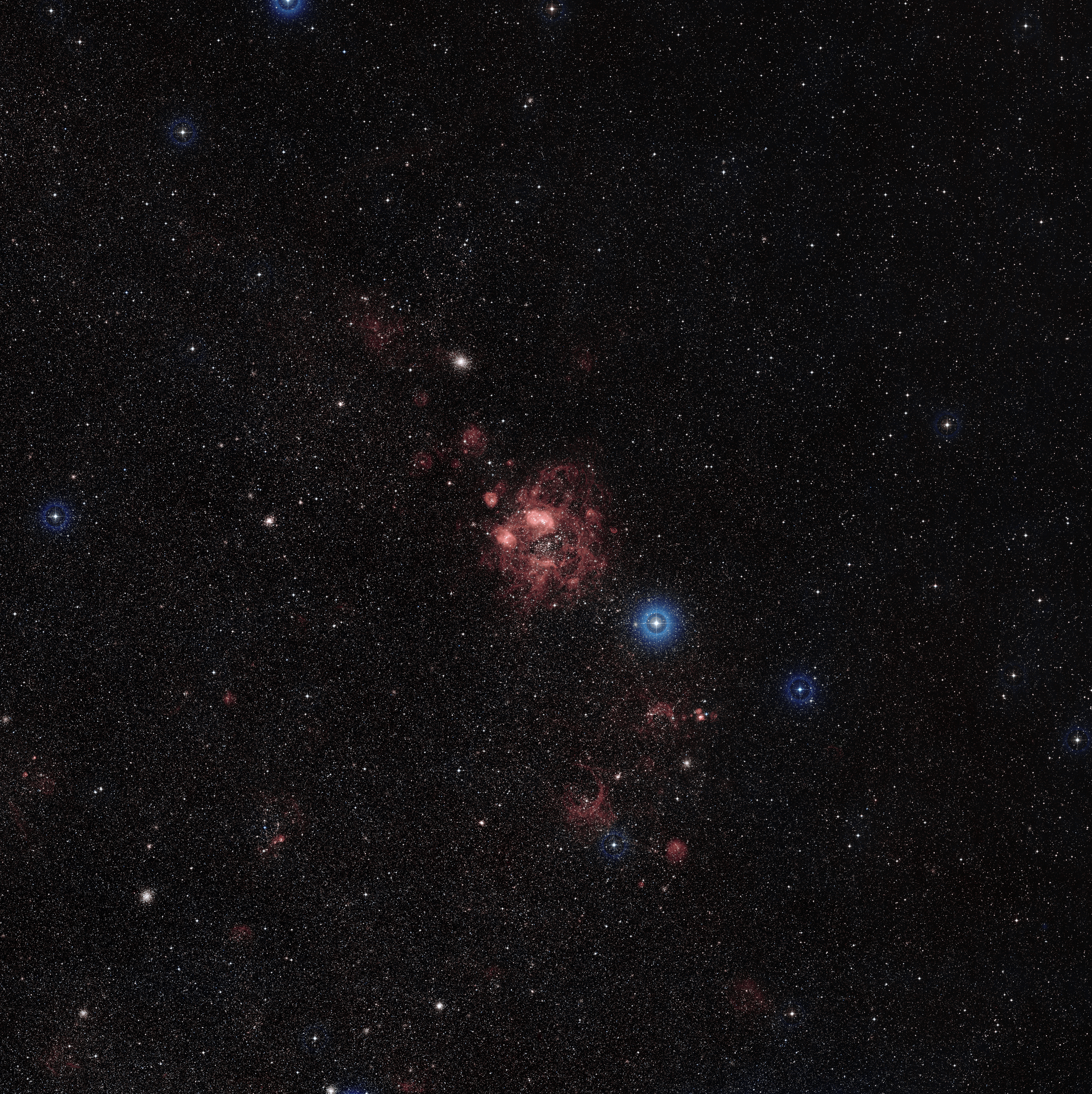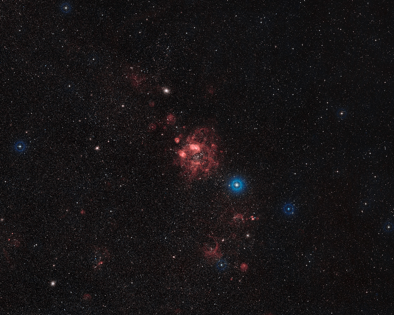 This wide field view of part of the Large Magellanic Cloud includes the location of the N11 star formation region. This image was created from digitised photographs through red and blue filters. The field of view is about three degrees across.