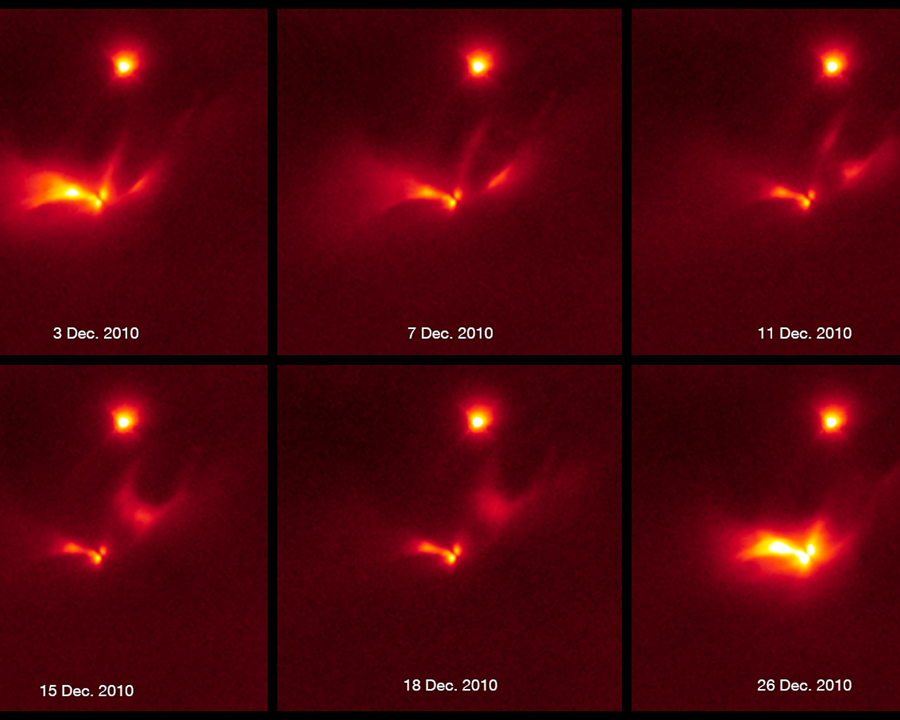 This sequence of images from the NASA/ESA Hubble Space Telescope shows a pulse of light emanating from the protostellar object LRLL 54361. Most if not all of this light results from scattering off circumstellar dust in the protostellar envelope.