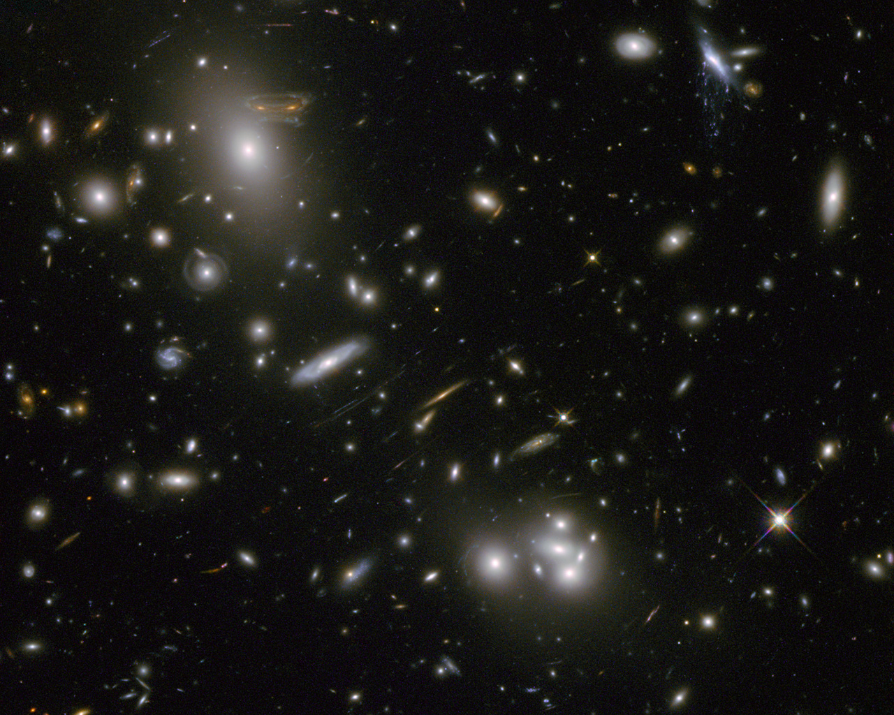 Abell 68, pictured here in infrared light, is a galaxy cluster. The effect of its gravity on light means it boosts Hubble's power, greatly increasing the telescope's ability to observe distant and faint objects. The fuzzy collection of blobs in the middle and upper left of the image is a swarm of galaxies, each with hundreds of billions of stars and vast amounts of dark matter. Distorted shapes visible throughout the field of view are distant galaxies whose light has been bent and amplified by the cluster.