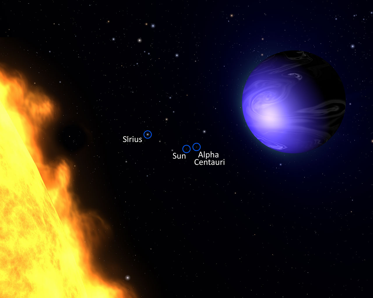 Because the planet is only 63 light-years from Earth, a visitor would see many of the same stars we see in our nighttime sky, though the constellation patterns would be different. Our Sun and the nearest star to our Sun, Alpha Centauri, are labelled here - two faint stars near the centre of the image. Also labelled is Sirius, the brightest star in our skies in the constellation of Canis Major (The Greater Dog).