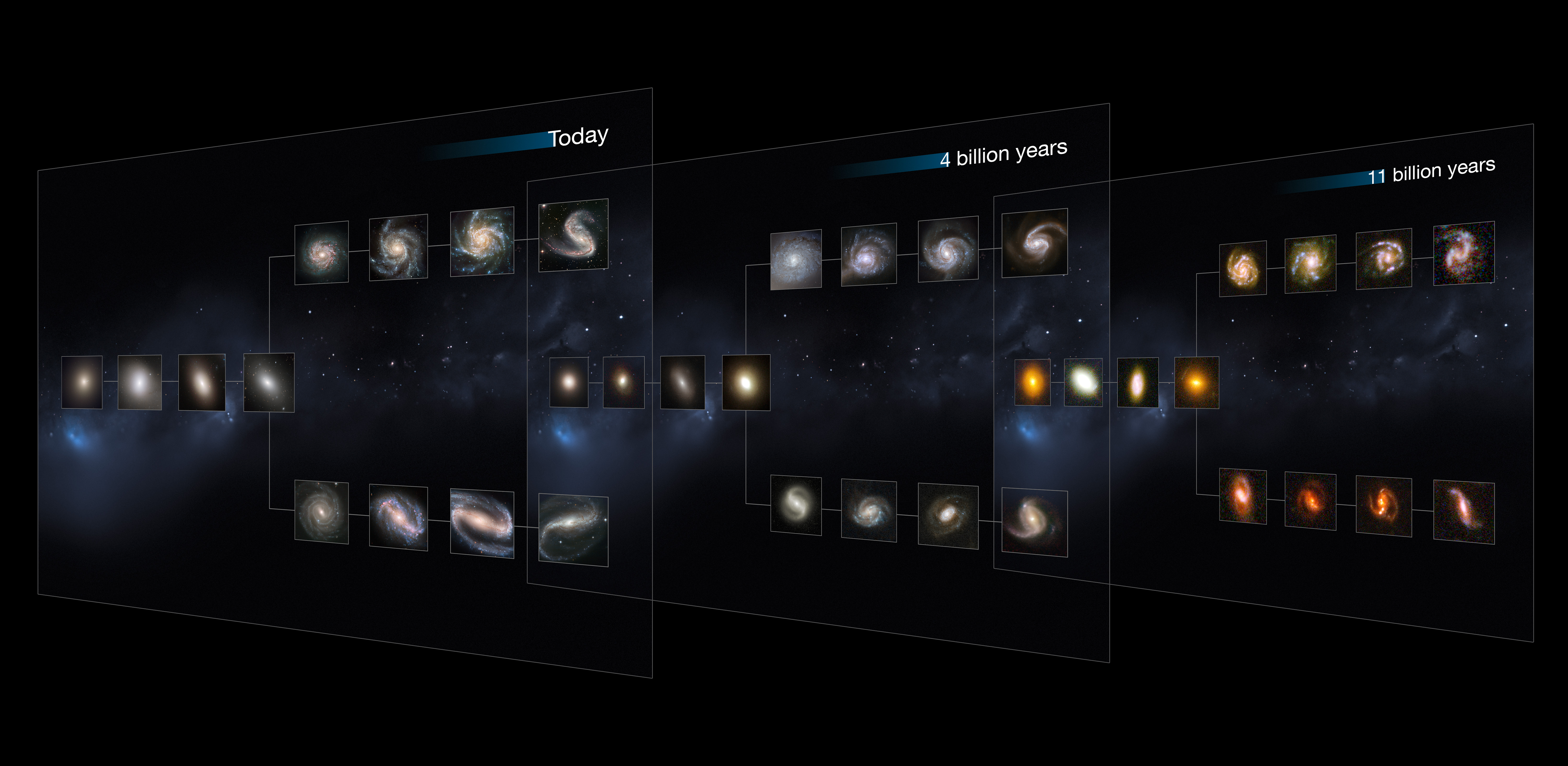 This image shows "slices" of the Universe at different times throughout its history (present day, and at 4 and 11 billion years ago). Each slice goes further back in time, showing how galaxies of each type appear. The shape is that of the Hubble tuning fork diagram, which describes and separates galaxies according to their morphology into spiral (S), elliptical (E), and lenticular (S0) galaxies. On the left of this diagram are the ellipticals, with lenticulars in the middle, and the spirals branching out on the right side. The spirals on the bottom branch have bars cutting through their centres.