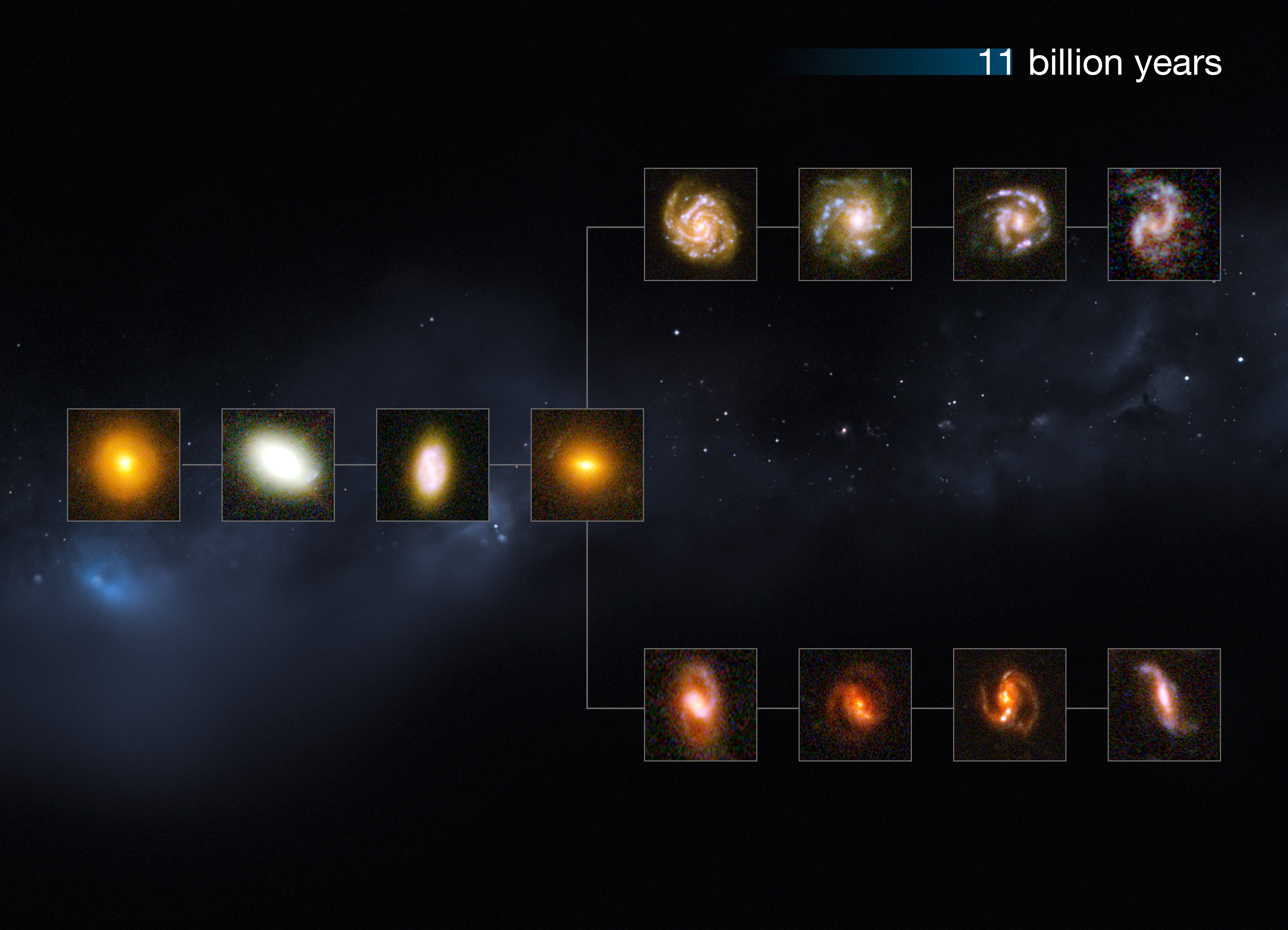 This image shows a "slice" of the Universe some 11 billion years back in time. The shape is that of the Hubble tuning fork diagram, which describes and separates galaxies according to their morphology into spiral (S), elliptical (E), and lenticular (S0) galaxies. On the left of this diagram are the ellipticals, with lenticulars in the middle, and the spirals branching out on the right side. The spirals on the bottom branch have bars cutting through their centres. The galaxies at these distances from us are small and still in the process of forming.