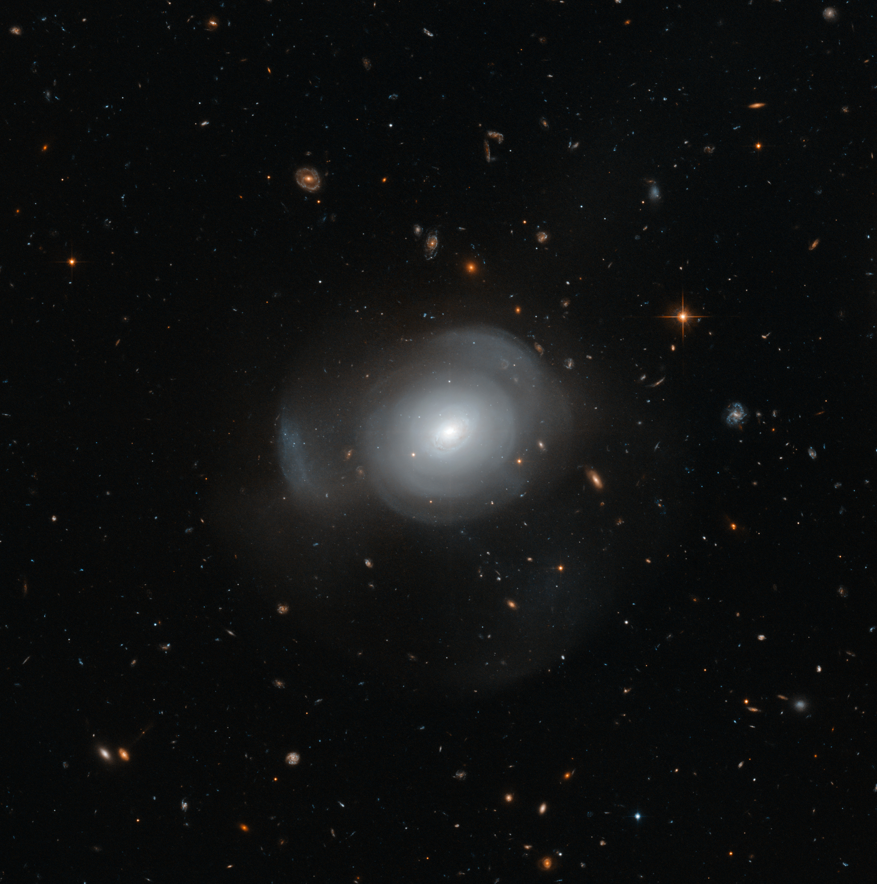 The beautiful, petal-like shells of galaxy PGC 6240 are captured here in intricate detail by the NASA/ESA Hubble Space Telescope, set against a sky full of distant background galaxies. PGC 6240 is an elliptical galaxy approximately 350 000 000 light years away in the southern constellation of Hydrus (The Water Snake). It is orbited by a number of globular clusters that contain both young and old stars – thought to be a result of a galactic merger in the recent past.