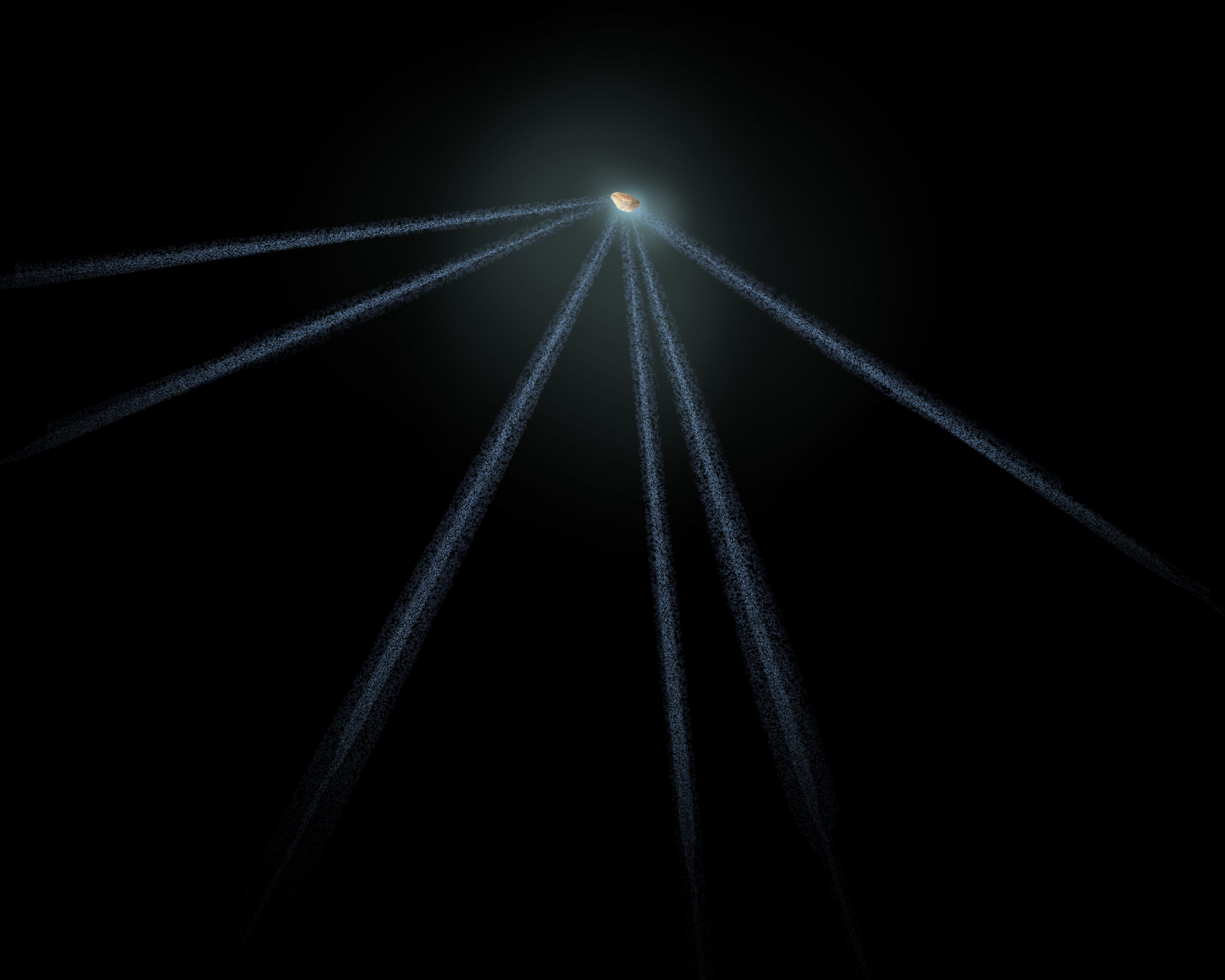 This is a diagram of the structure seen around an active asteroid designated P/2013 P5. The NASA/ESA Hubble Space Telescope imaged six dust tails in September 2013. One interpretation is that the asteroid's rotation rate has increased to the point where dust is falling off the surface along the equator and escaping into space. The pressure of sunlight then sweeps the dust into long tails. The entire structure rotates like a wheel.