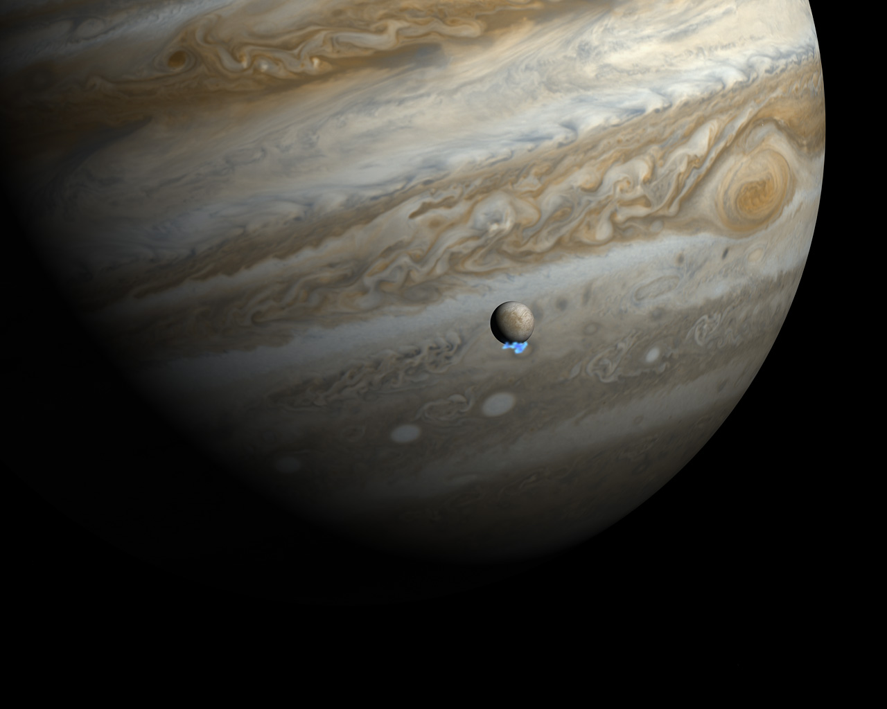 This artist's impression shows Jupiter and its moon Europa using actual Jupiter and Europa images in visible light. The Hubble ultraviolet images showing the faint emission from the water vapour plumes have been superimposed, respecting the size but not the brightness of the plumes.