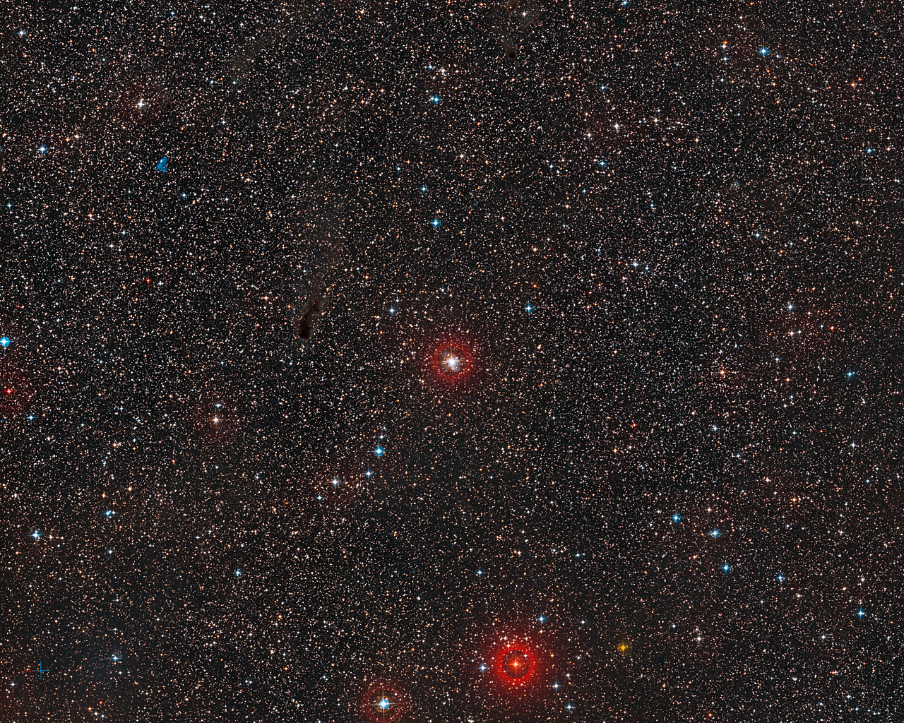 Also visible towards the bottom centre of the field is another variable star known as Y Puppis. Like RS Puppis, it too is a pulsating star, although its period is a little less regular. It is part of a multiple star system over 400 light-years away from us. This star is very bright in the infrared, and is seen as a fiery red colour.