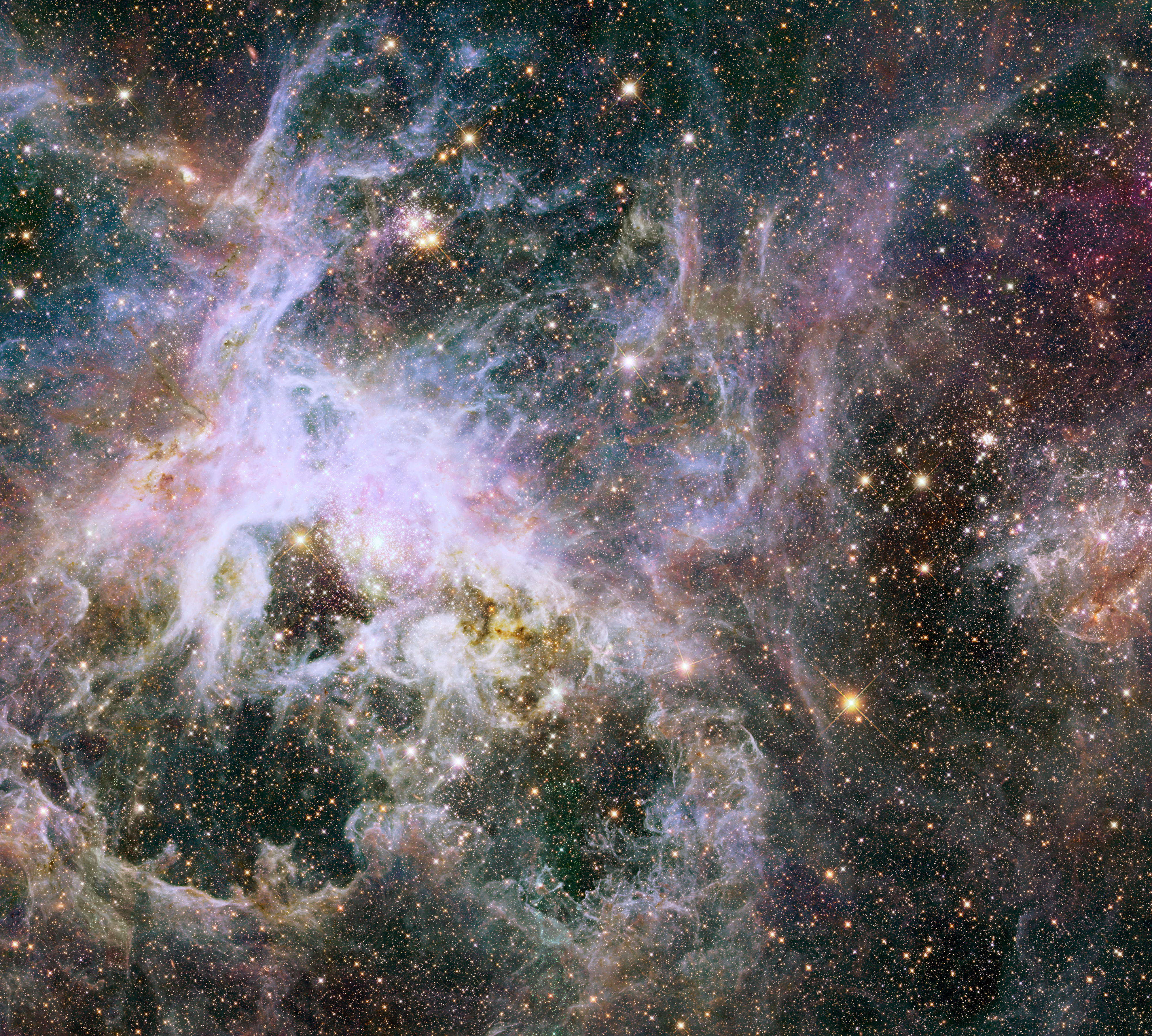 Created using observations taken as part of the Hubble Tarantula Treasury Project (HTTP), this image was snapped using Hubble's Wide Field Camera 3 (WFC3) and Advanced Camera for Surveys (ACS). The Hubble Tarantula Treasury Project (HTTP) is scanning and imaging many of the many millions of stars within the Tarantula, mapping out the locations and properties of the nebula's stellar inhabitants. These observations will help astronomers to piece together an understanding of the nebula's skeleton, viewing its starry structure.