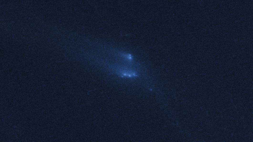 This image shows NASA/ESA Hubble Space Telescope observations of asteroid P/2013 R3. This asteroid has been found to be disintegrating and breaking apart – the first such body ever seen to do this.