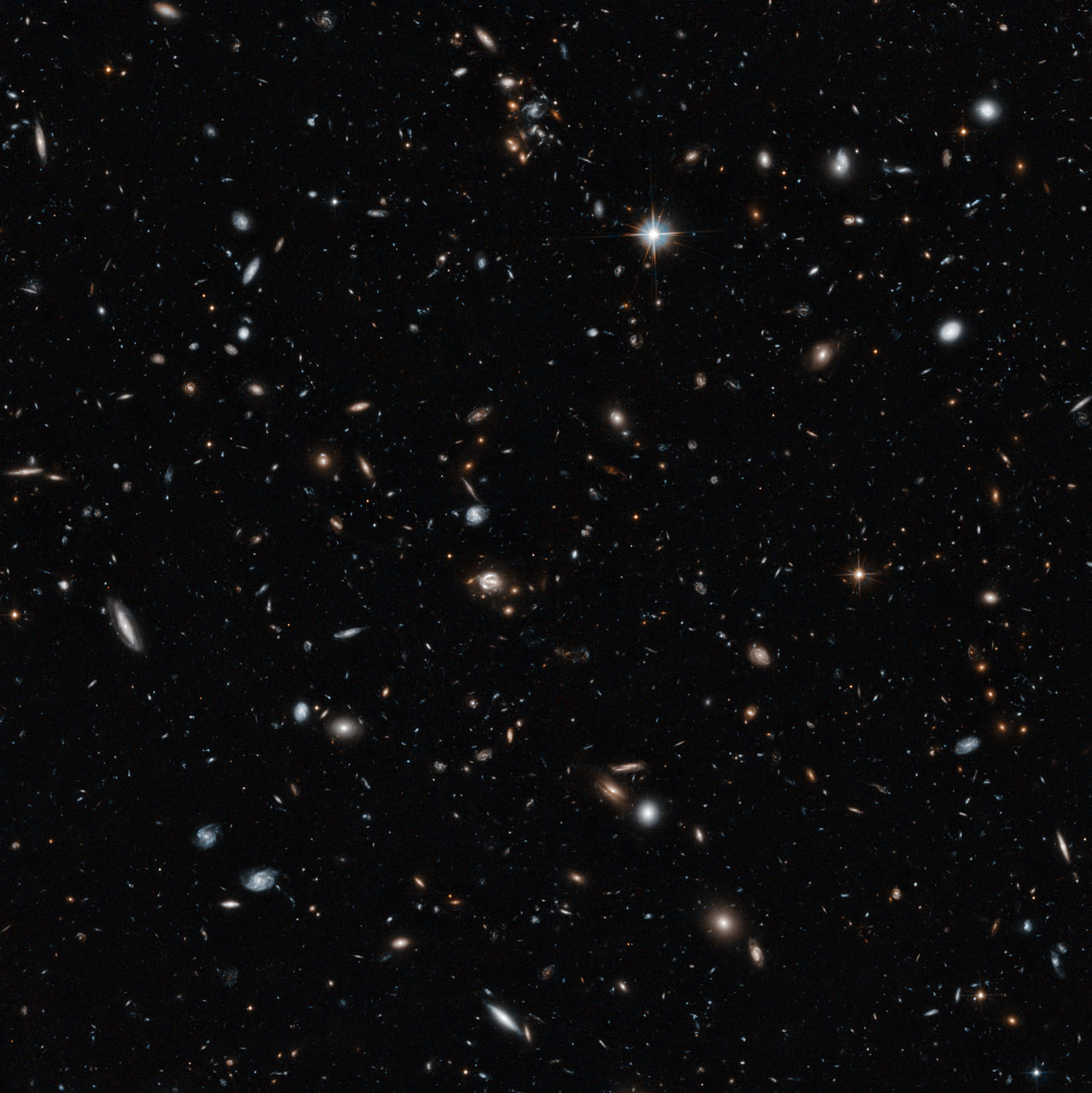 An image of a galaxy cluster taken by the NASA/ESA Hubble Space Telescope gives a remarkable cross-section of the Universe, showing objects at different distances and stages in cosmic history. They range from cosmic near neighbours to objects seen in the early years of the Universe. The 14-hour exposure shows objects around a billion times fainter than can be seen with the naked eye.