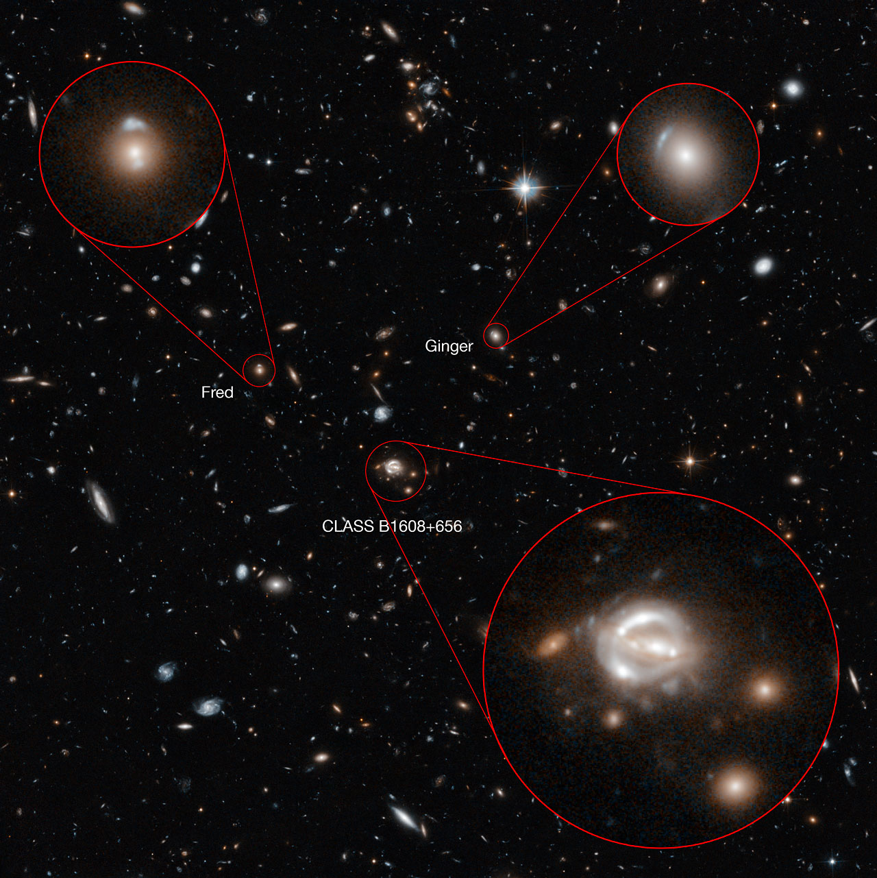 These contain enough mass to visibly distort the light from objects behind them. Fred, also known more prosaically as [FMK2006] ACS J160919+6532, lies near the lens galaxies in CLASS B1608+656, while Ginger ([FMK2006] ACS J160910+6532) is markedly closer to us. Despite their different distances from us, both can be seen near to CLASS B1608+656 in the central region of this Hubble image, and are labelled.