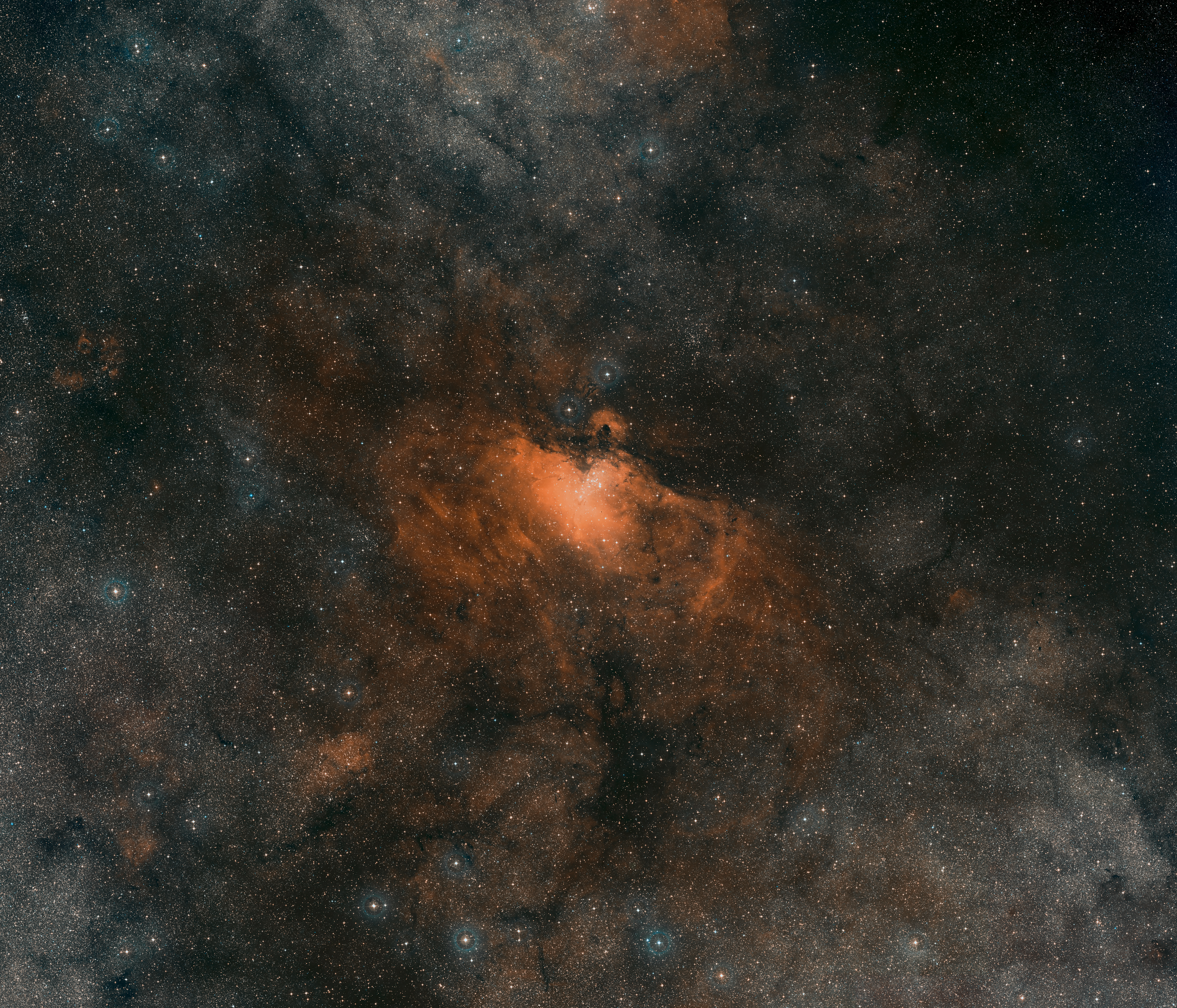 This image is a colour composite of the Eagle Nebula (M16) made from exposures from the Digitized Sky Survey 2 (DSS2). The field of view is approximately 3.8 × 3.3 degrees.