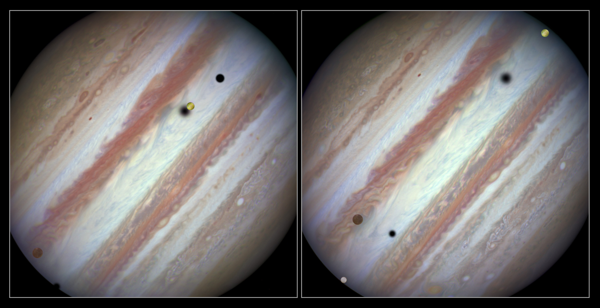 The image on the left shows the Hubble observation at the beginning of the event. On the left is the moon Callisto and on the right, Io. The shadows from Europa, which cannot be seen in the image, Callisto, and Io are strung out from left to right.