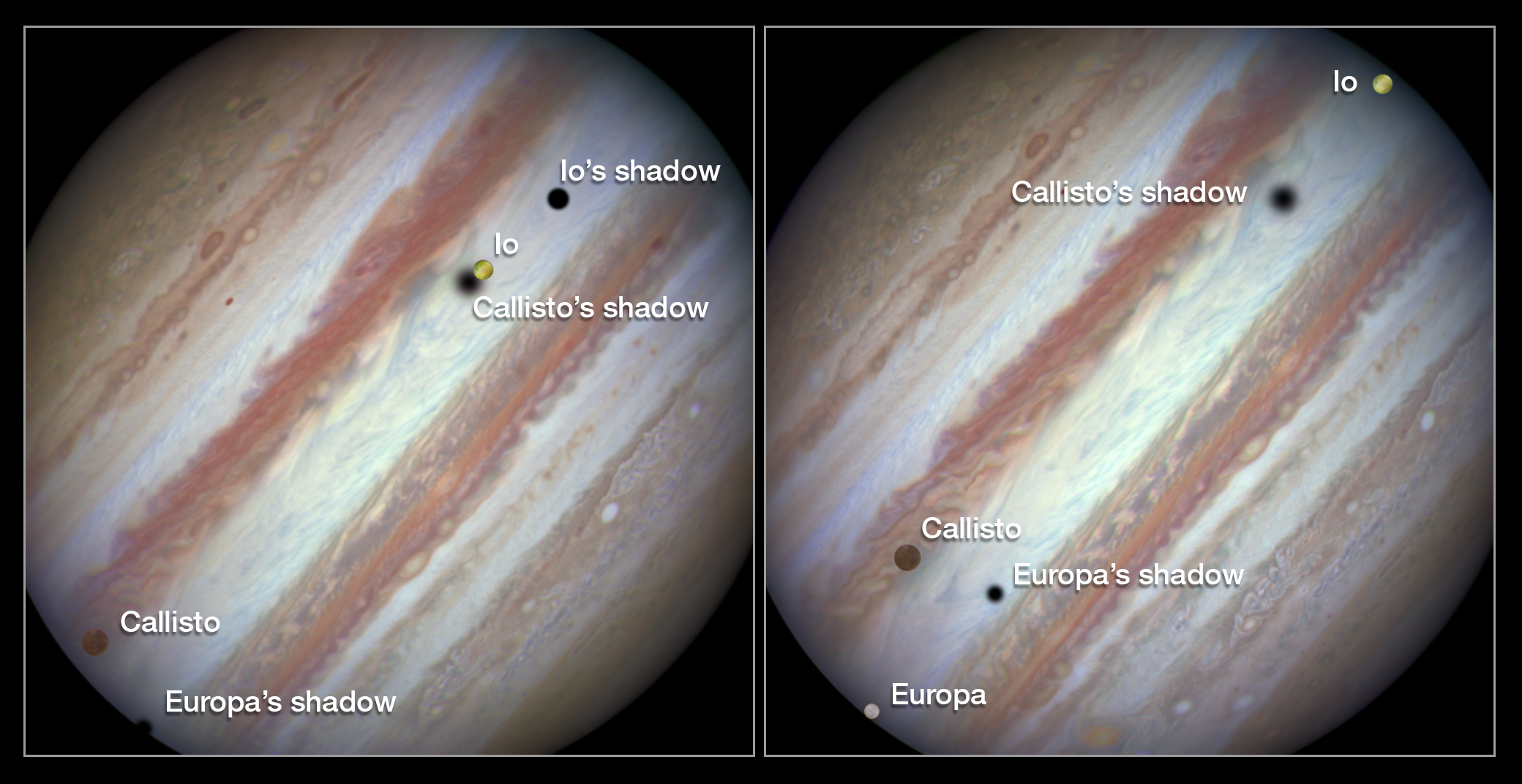 Three moons and their shadows parade across Jupiter - comparison of beginning and end of sequence, with annotations