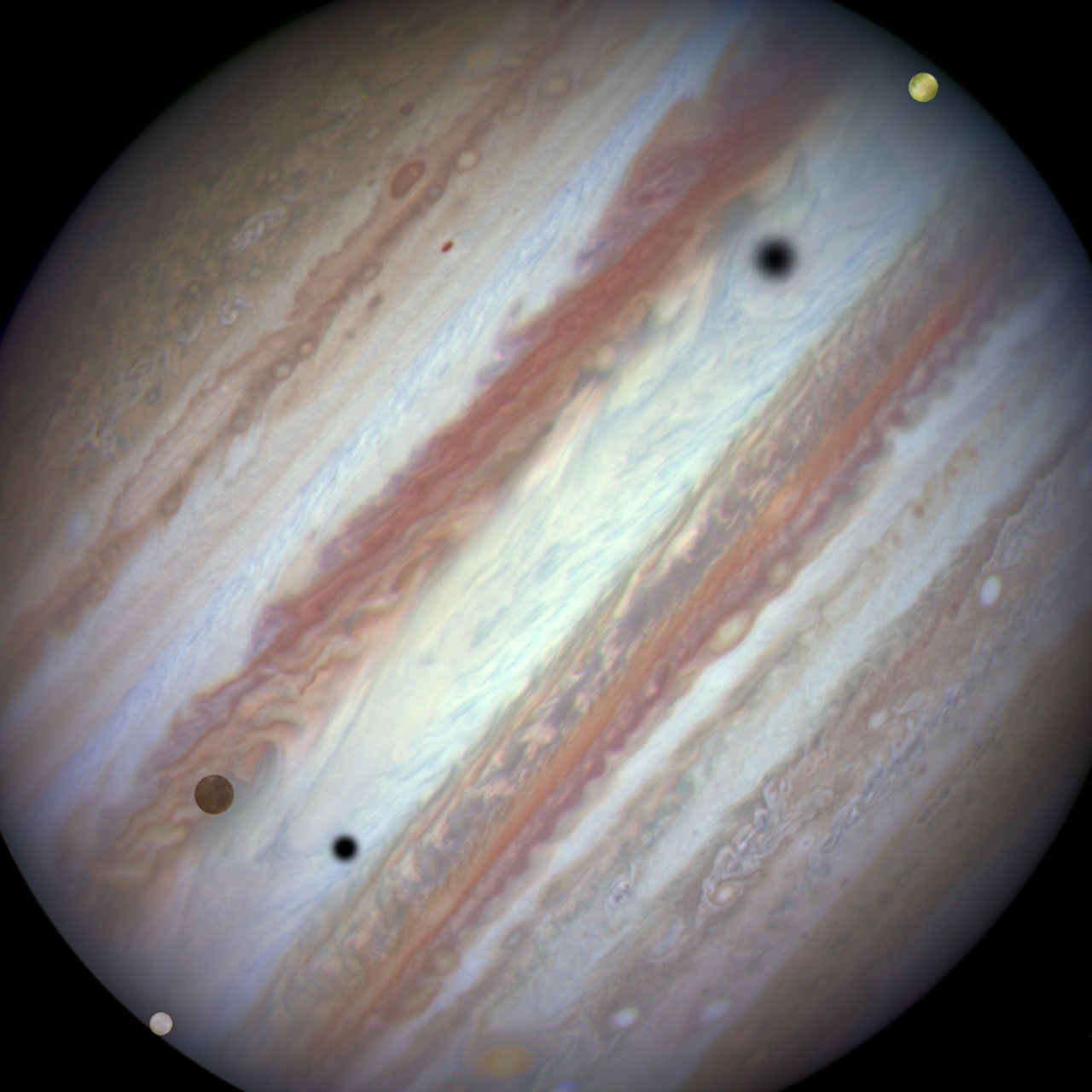 The image shows the end of the event. Europa has entered the frame at lower left with slower-moving Callisto above and to the right of it. Meanwhile Io – which orbits significantly closer to Jupiter – is approaching the eastern limb of the planet.