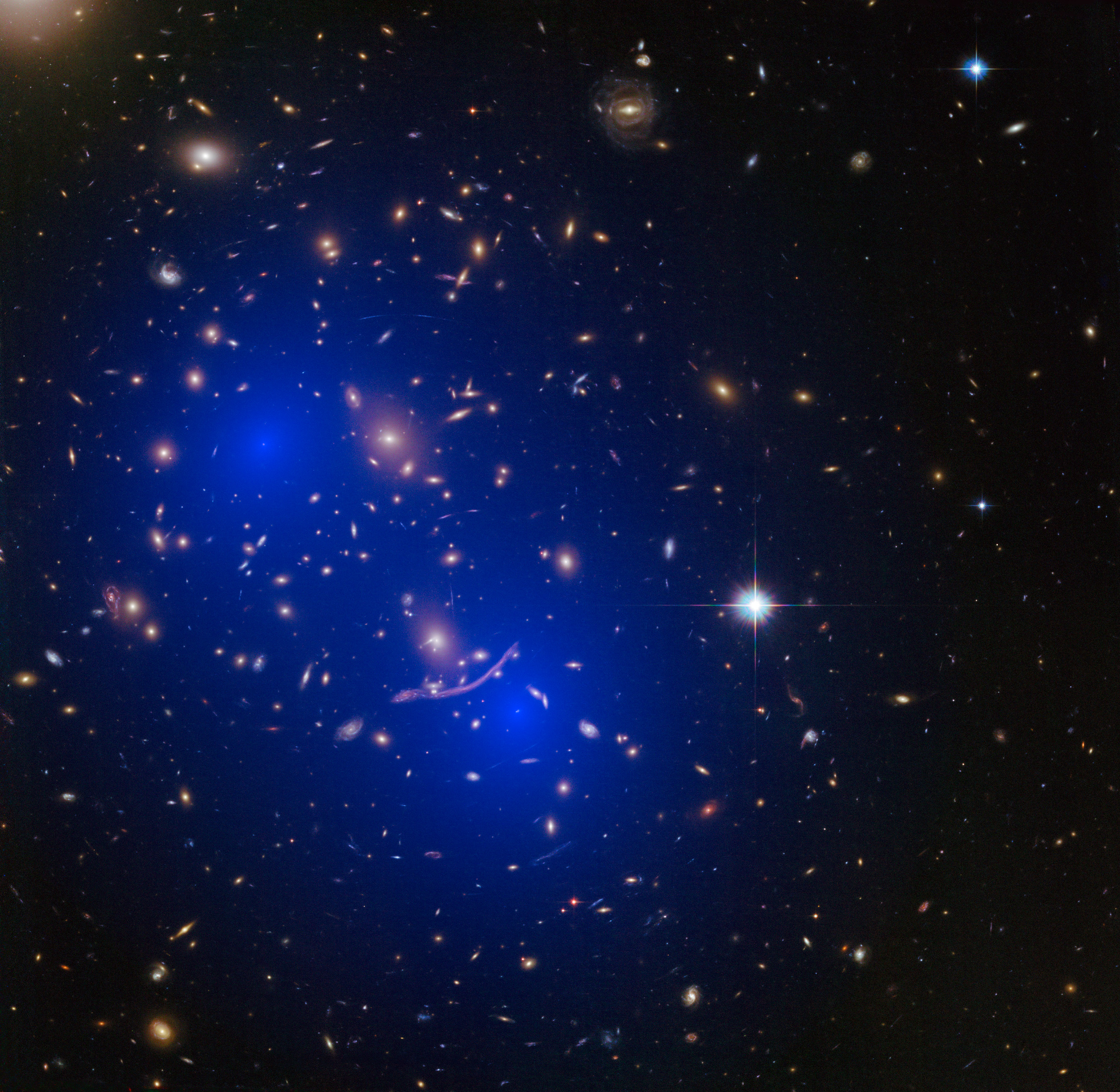 This is a NASA/ESA Hubble Space Telescope image of the galaxy cluster Abell 370. Shown in blue on the image is a map of the dark matter found within the cluster. This cluster was part of a study of 72 galaxy cluster collisions which determined that dark matter interacts with other dark matter even less than previously thought.