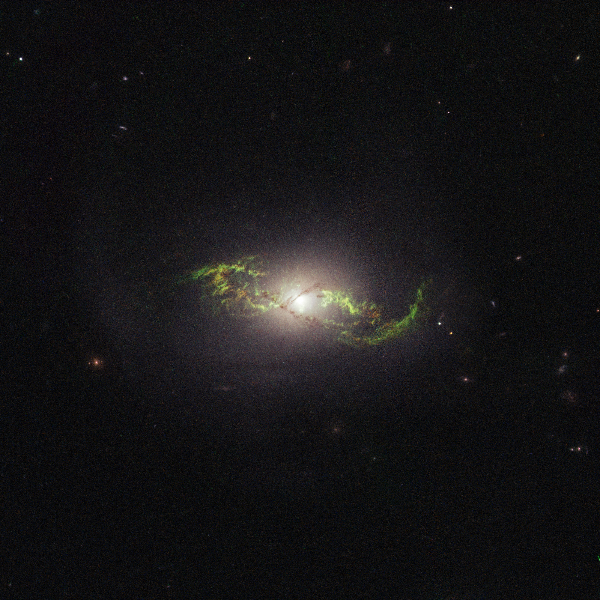 This new NASA/ESA Hubble Space Telescope image shows ghostly green filaments, lying within galaxy NGC 5972. This filament was illuminated by a blast of radiation from a quasar – a very luminous and compact region that surrounds the supermassive black hole at the centre of its host galaxy.
