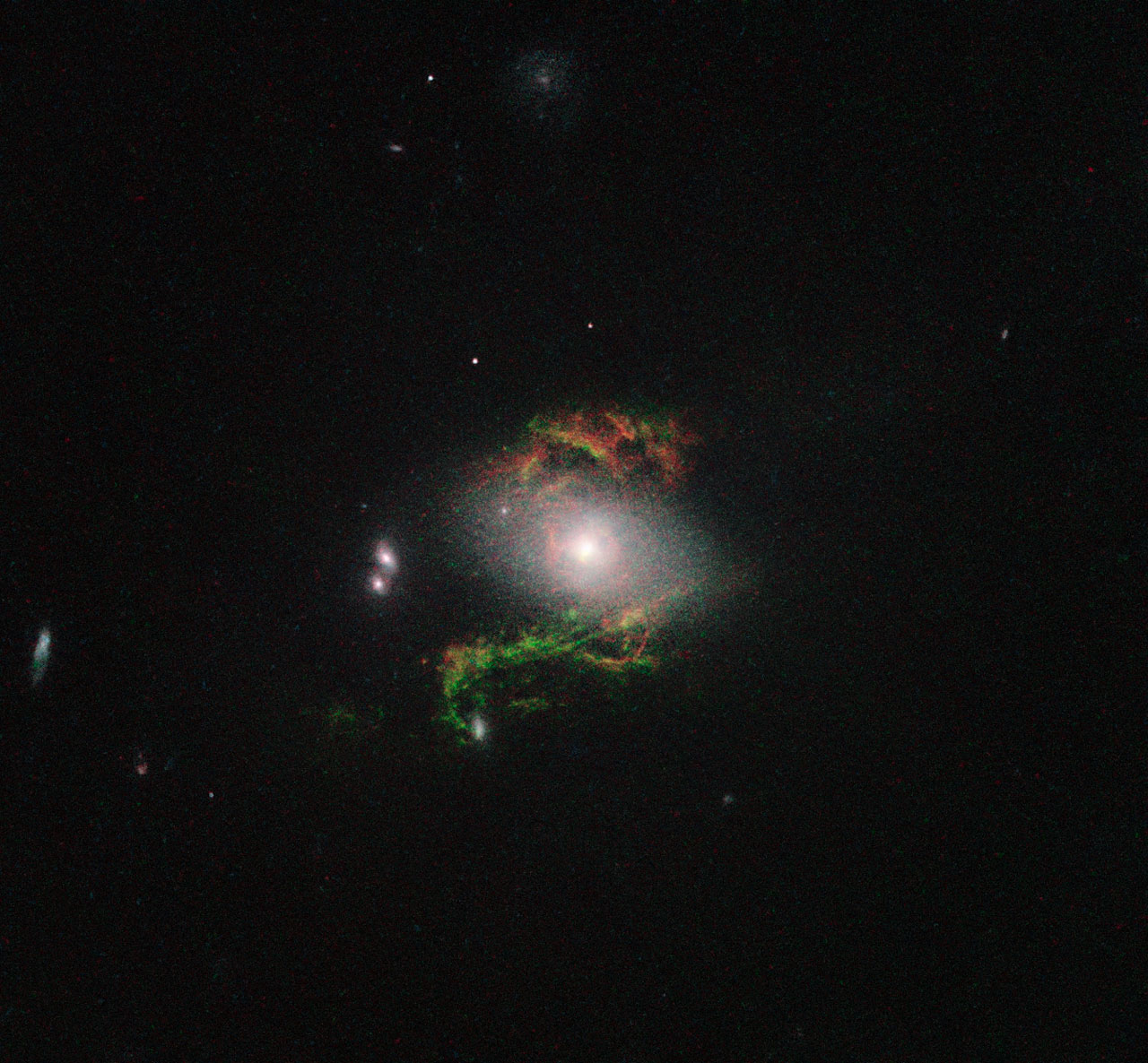 This new NASA/ESA Hubble Space Telescope image shows ghostly green filaments, lying within galaxy 2MASX J15100402+0740370. This filament was illuminated by a blast of radiation from a quasar – a very luminous and compact region that surrounds the supermassive black hole at the centre of its host galaxy.