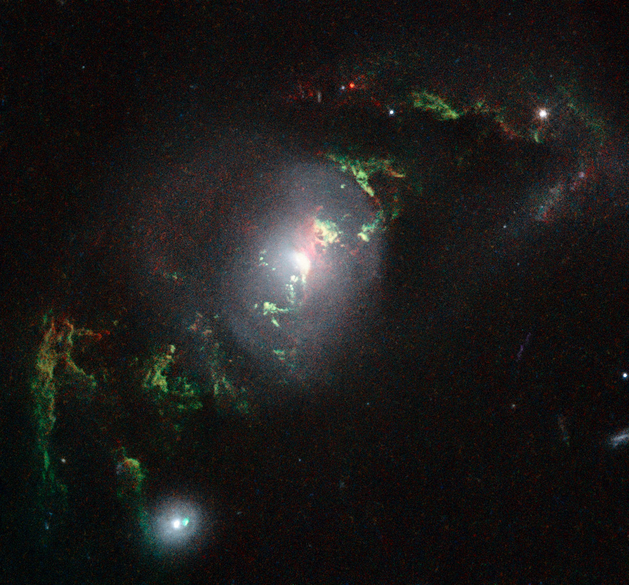 This new NASA/ESA Hubble Space Telescope image shows ghostly green filaments, lying within galaxy UGC 7342. This filament was illuminated by a blast of radiation from a quasar – a very luminous and compact region that surrounds the supermassive black hole at the centre of its host galaxy.