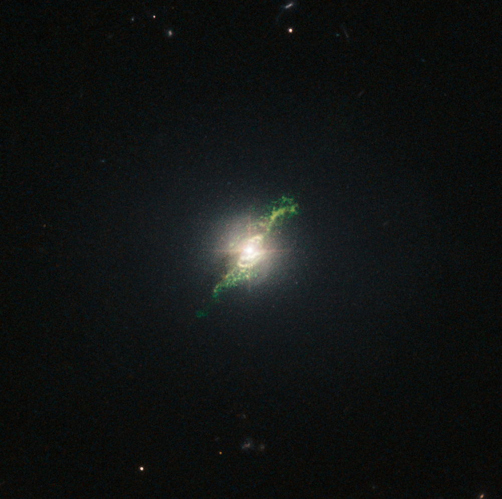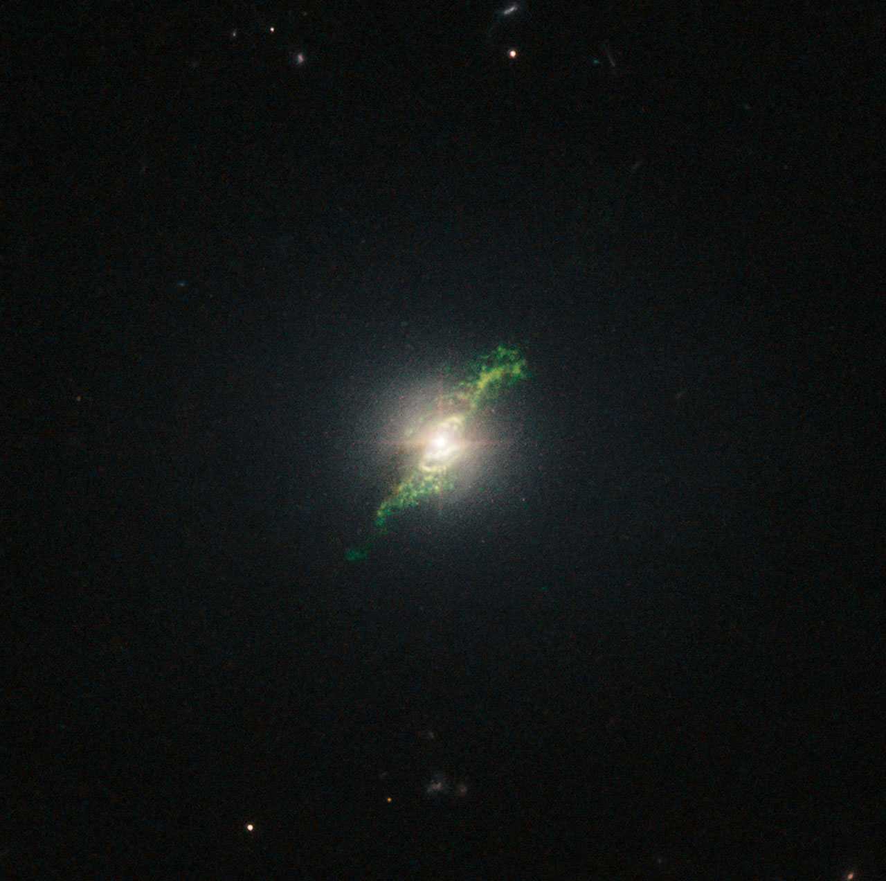 This new NASA/ESA Hubble Space Telescope image shows ghostly green filaments, lying within galaxy Mrk 1498. This filament was illuminated by a blast of radiation from a quasar – a very luminous and compact region that surrounds the supermassive black hole at the centre of its host galaxy.