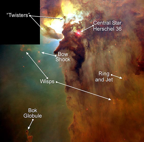 This Hubble Space Telescope (HST) image reveals a pair of one-half light-year long interstellar 'twisters' – eerie funnels and twisted-rope structures (upper left) – in the heart of the Lagoon Nebula (Messier 8) which lies 5000 light-years away in the direction of the constellation Sagittarius.