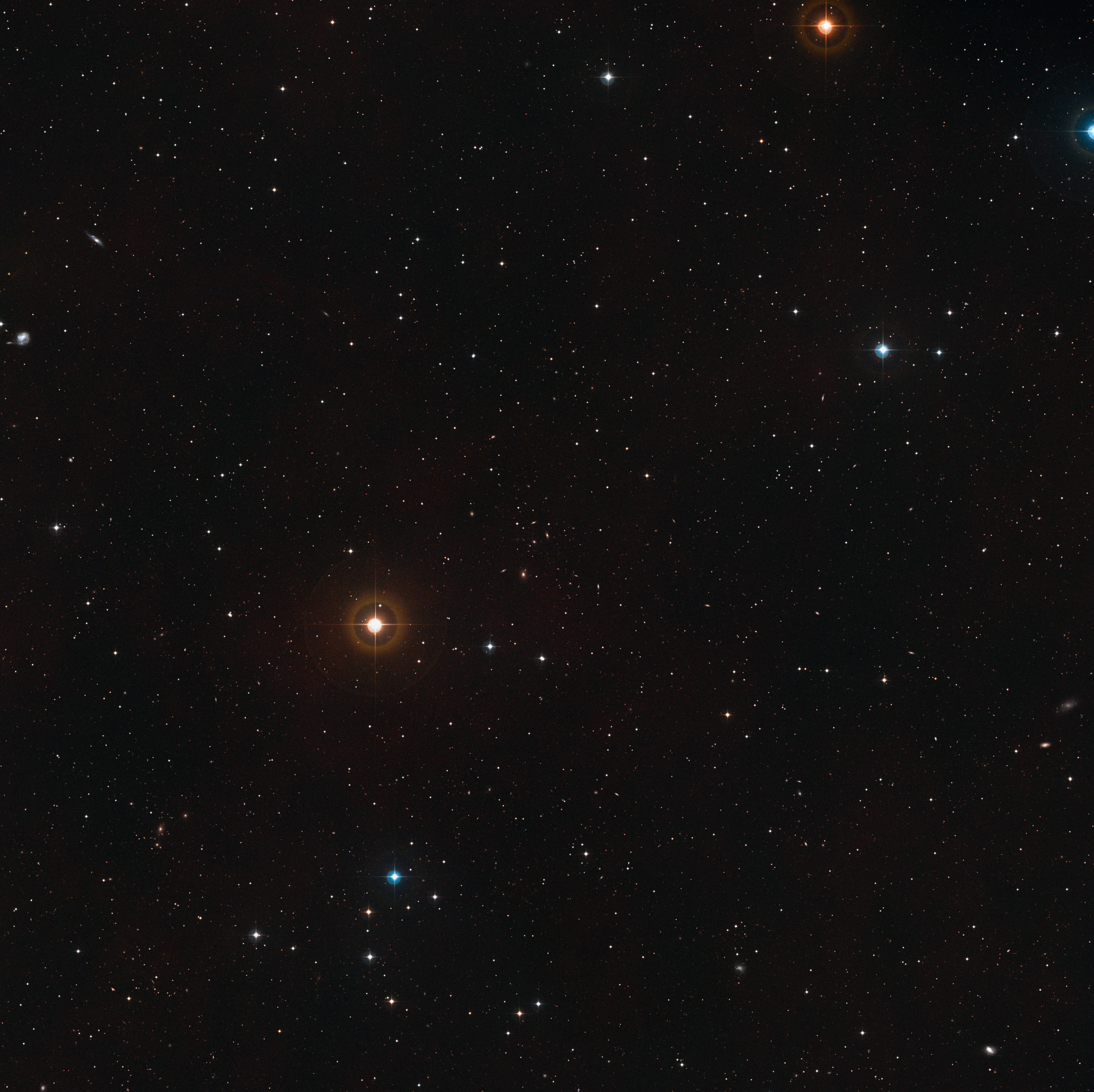 This image shows the region of sky around the the distant galaxy cluster SpARCS1049+56. It took the light of the cluster 9.8 billion light-years to reach us. The cluster houses at least 27 galaxies, probably more, and has a combined mass equal to 400 trillion Suns.