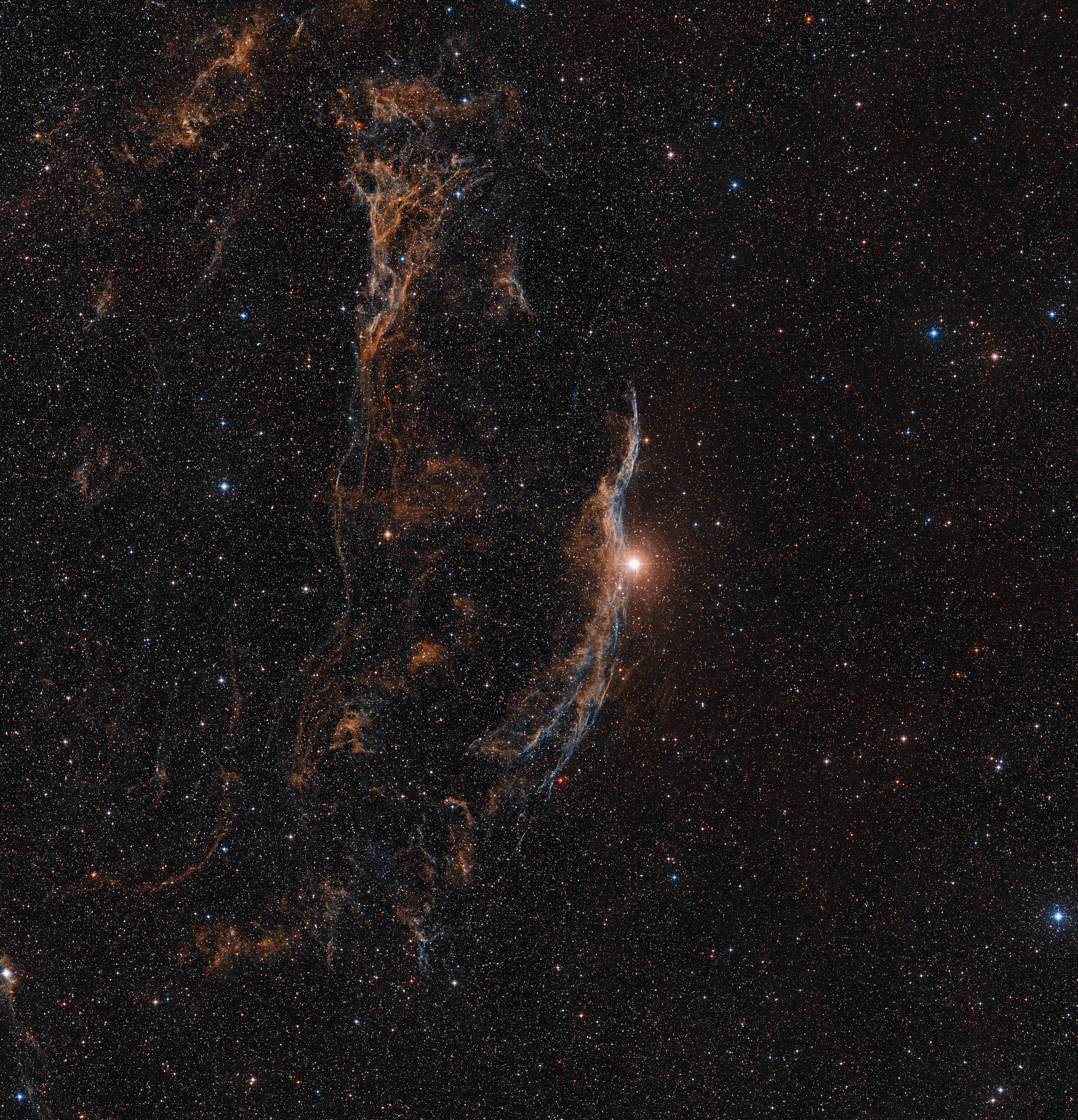 This image shows the Veil supernova remnant and the surrounding sky. Due to the size of the Nebula the NASA/ESA Hubble Space Telescope was able to only observe a small part of it in detail.