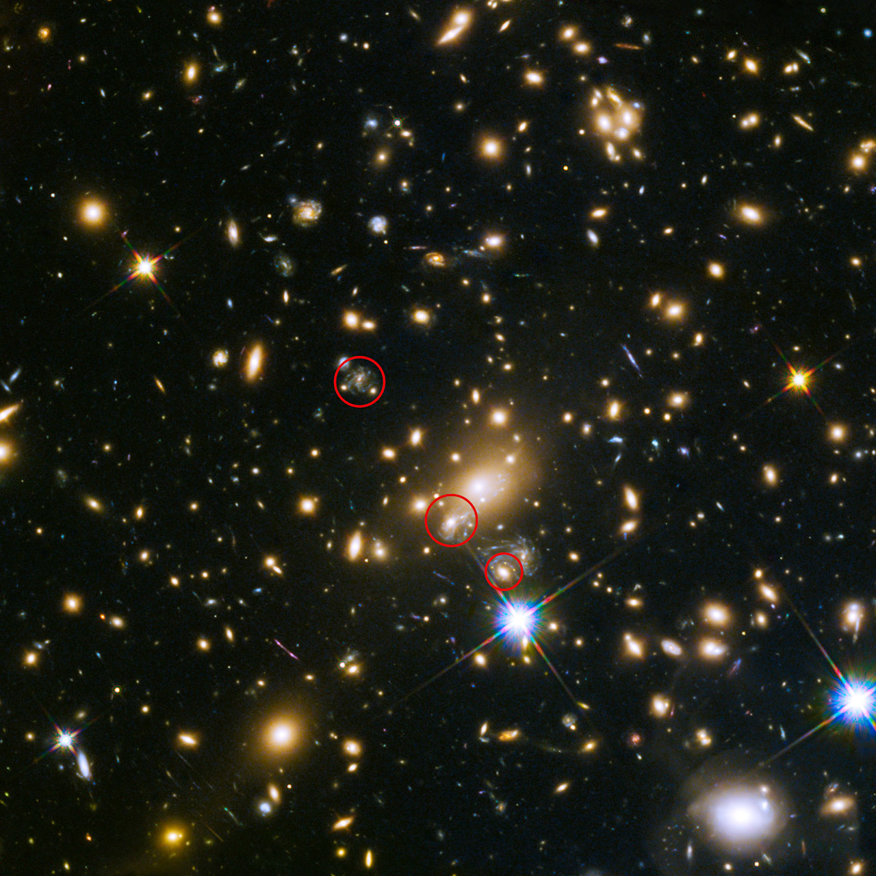 This image shows the appearances of the Refsdal supernova. The uppermost circle shows the position of the supernova as it could have been seen in 1998. The lowermost circle shows the galaxy which lensed the supernova four time – a discovery made in late 2014. The middle circle shows the latest position of the reappearing supernova in 2015.