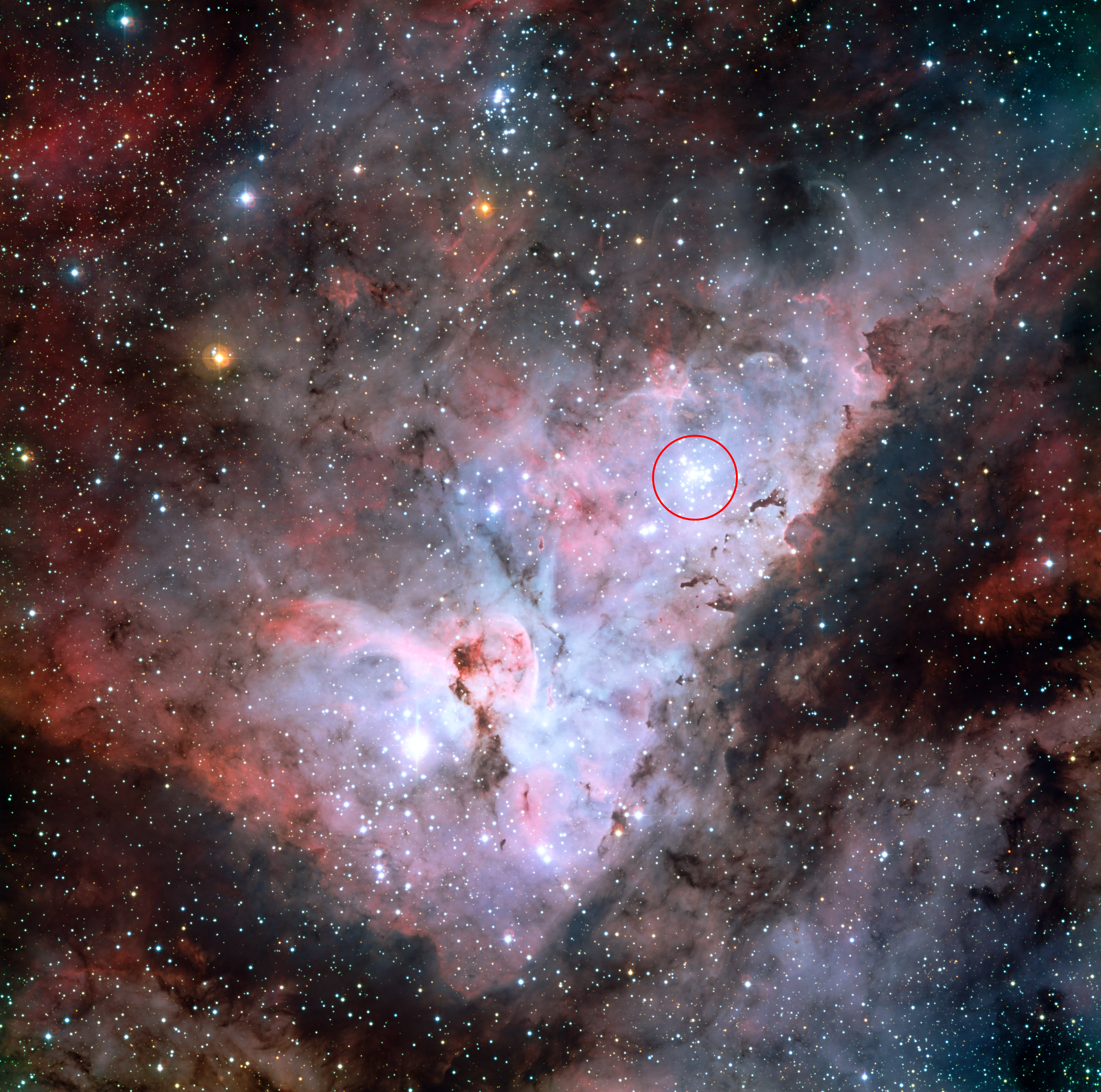 This colour-composite image of the Carina Nebula, made by the MPG/ESO 2.2-metre telescope at La Silla, Chile, reveals exquisite details in the stars and dust of the region. The open star cluster Trumpler 14, a collection of very bright, young stars within the Carina Nebula, is marked with a red circle.