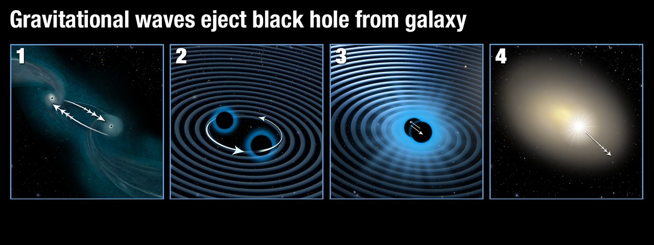 This illustration shows how two supermassive black holes merged to form a single black hole which was then ejected from its parent galaxy.