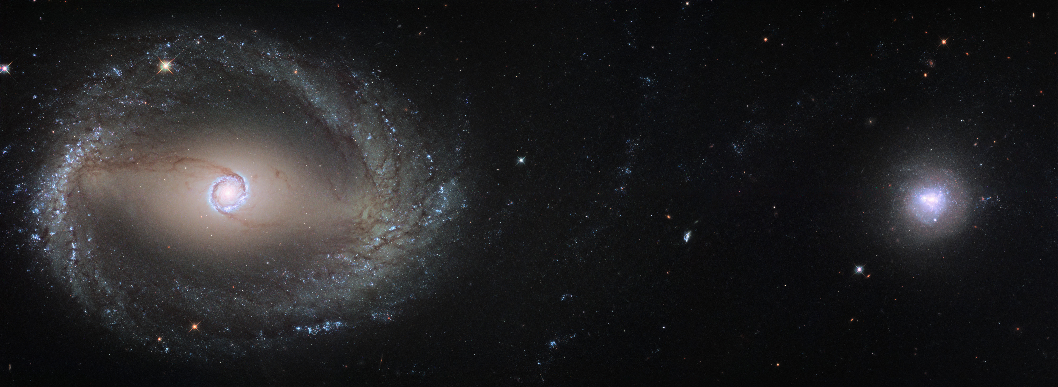 This composite image, created out of two different pointings from Hubble, shows the barred spiral galaxy NGC 1512 (left) and the dwarf galaxy NGC 1510 (right). Both galaxies are about 30 million light-years away from Earth and currently in the process of merging. At the end of this process NGC 1512 will have cannibalised its smaller companion.