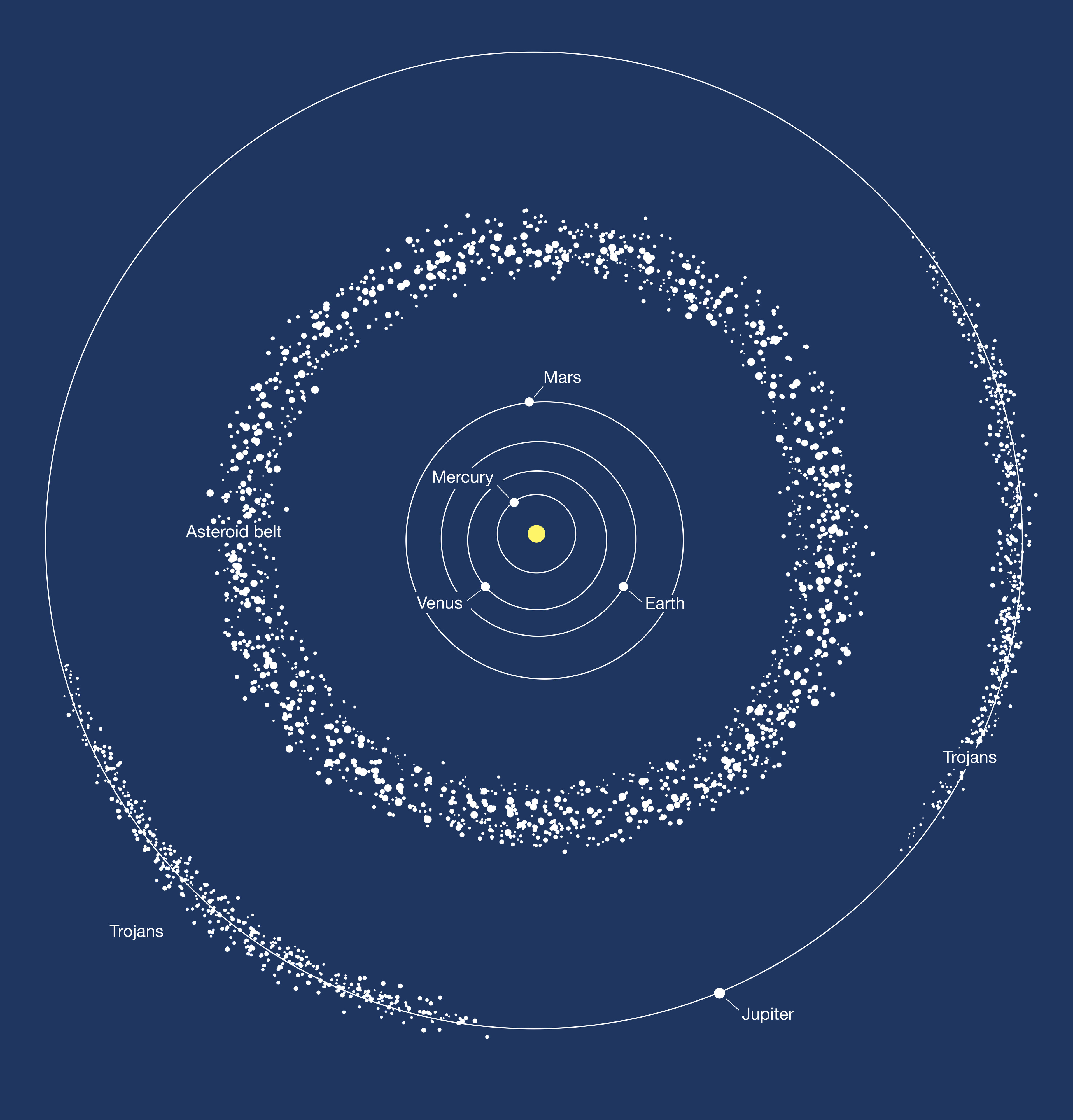 This image depicts the two areas where most of the asteroids in the Solar System are found: the asteroid belt between Mars and Jupiter, and the Trojans, two groups of asteroids moving ahead of and following Jupiter in its orbit around the Sun.