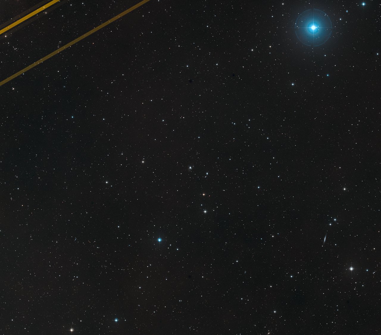 This wide-field image shows the pair of galaxies known as NGC 5256 and their surroundings as seen from the ground. In the upper left corner two planes crossed the image. Due to the long exposure their position lights cause long streaks in the final image.