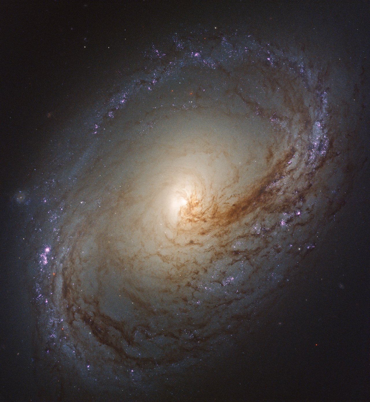 A wave of star formation is occurring along the dark filaments that make up the spiral arms. The fledgling stars illuminate the surrounding hydrogen gas, making the stars appear pink. Star birth begins at the inner spiral arms and moves outward. The milky white regions in the centre of these galaxies represent the glow of countless stars.