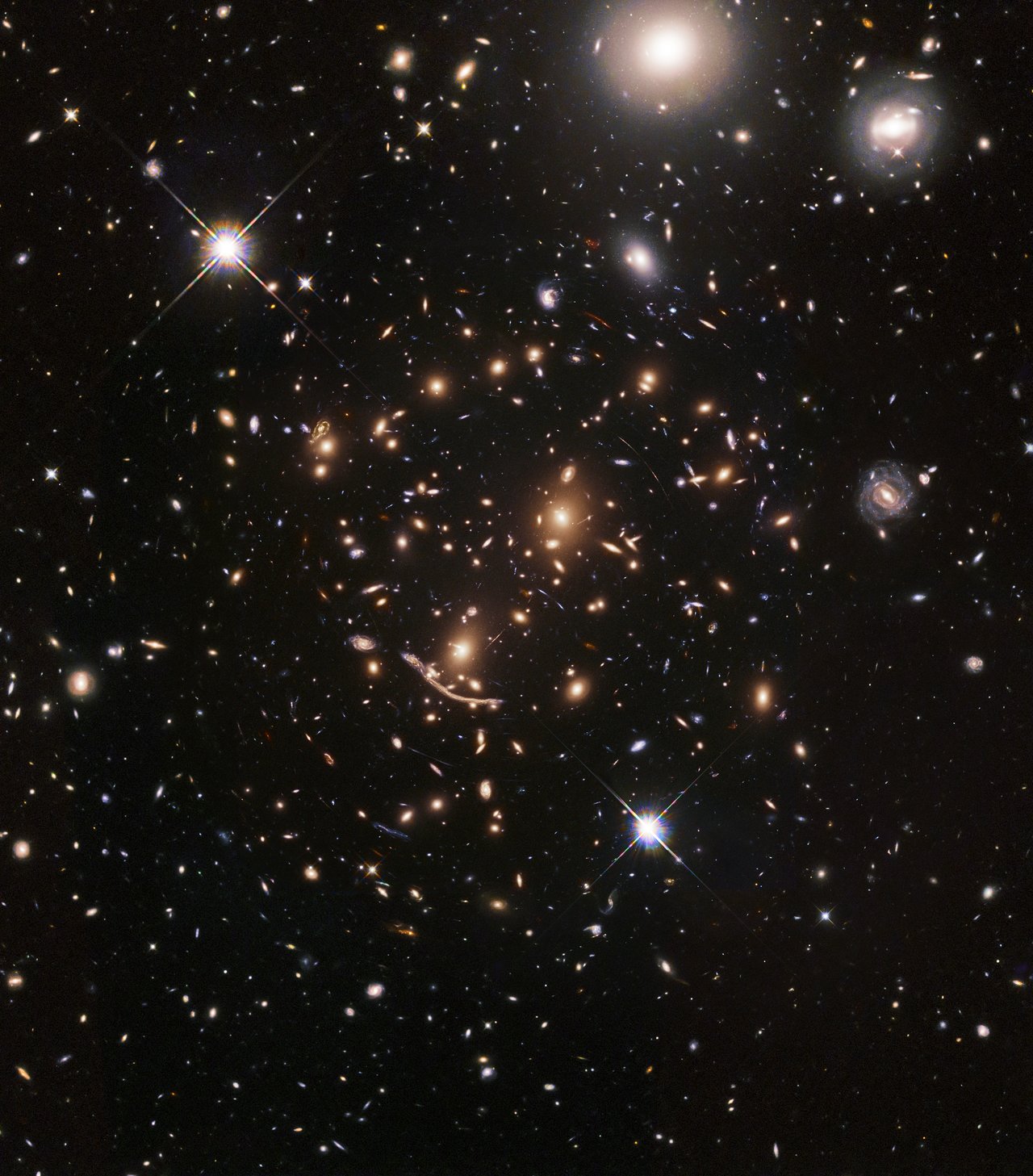 This remarkable cluster in the constellation of Cetus is located approximately four billion light-years away. Its mass, consisting of both hundreds of galaxies and dark matter, bends and distorts the light coming from even more distant objects behind it. This effect is known as strong gravitational lensing.