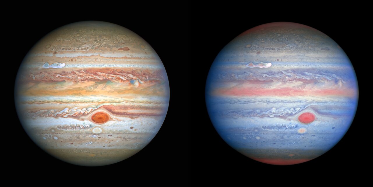 [Right] This multiwavelength observation in ultraviolet/visible/near-infrared light of Jupiter was obtained by the Hubble Space Telescope on 25 August 2020 and is giving researchers an entirely new view of the giant planet. Hubble's near-infrared imaging, combined with ultraviolet views, provides a unique panchromatic look that offers insights into the altitude and distribution of the planet's haze and particles. This complements Hubble's visible-light pictures that show the ever-changing cloud patterns.