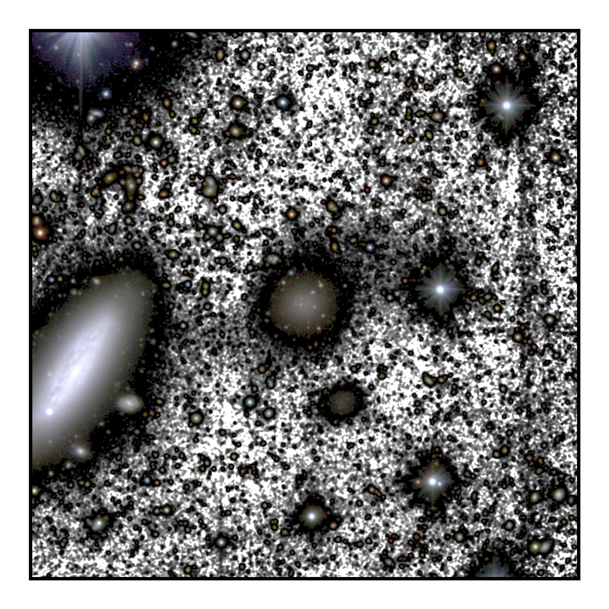 This image presents the region around the galaxy NGC 1052-DF4, taken by the IAC80 telescope at the Teide Observatory in Tenerife. The figure highlights the main galaxies in the field-of-view, including NGC 1052-DF4 (centre of the image), and its neighbour NGC 1035 (centre left).