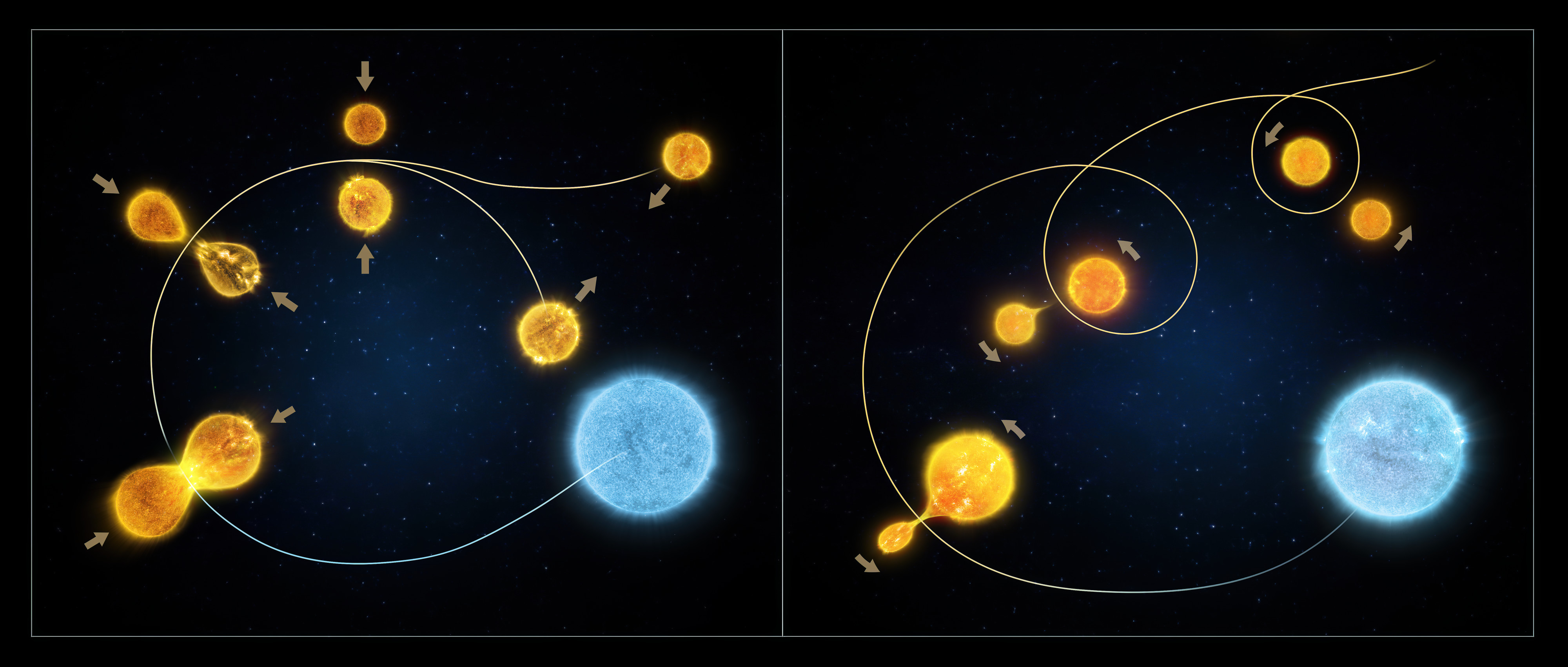 The illustration on the right depicts the "vampire" model consisting of a pair of stars that undergo a transformation, with the lower-mass star draining its larger-mass companion of the hydrogen that fuels its rebirth.