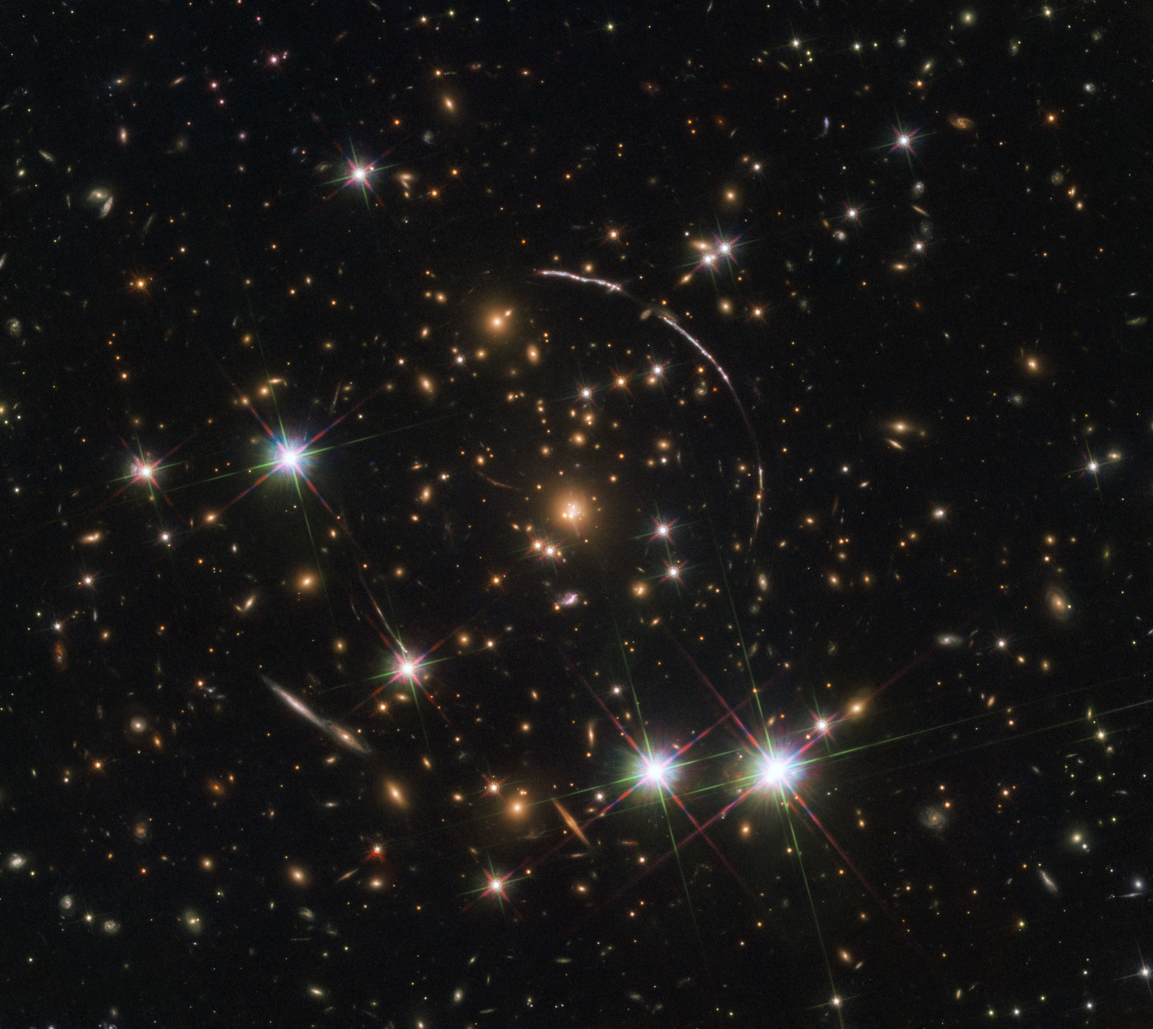 This image, taken with the NASA/ESA Hubble Space Telescope, shows a massive galaxy cluster, about 4.6 billion light years away. Along its borders four bright arcs are visible; these are copies of the same distant galaxy, nicknamed the Sunburst Arc.